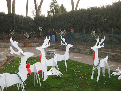 Big John finishes his grounds duties tomorrow and was a big help today with installing the deer fencing. John also did various odds and ends and we'll continue to do some of our last tweaking for the Holiday Lights Show (HLS). Strong winds this weekend tangled up a good portion of our dangling icicle lights but we're trying to everything in place before the premiere lighting of the HLS for the Taste of Chocolate event (might be sold out already...). Larry helped with many HLS duties today and worked with Tom C. on some final improvements. The two photos below were taken last Wednesday at our second testing night. Everything looked great and stayed on all day! I'm working on 2012 "closure items" but am balancing that with 2013 preparations (seed ordering, presentations, etc.).