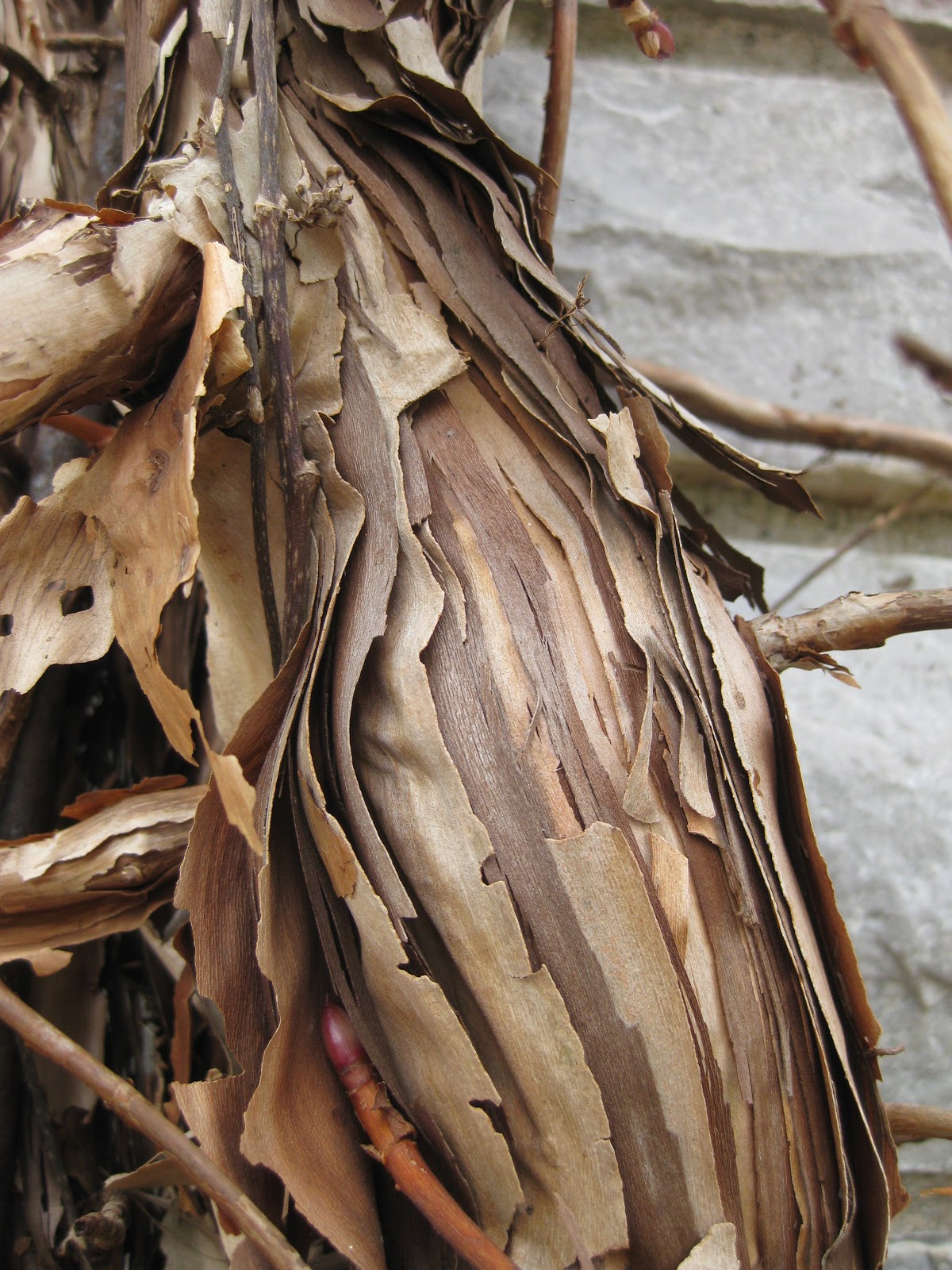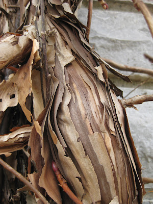 I've never walked out in the gardens (or any garden) with my camera and not taken shots of interesting features like the ornamental bark of the climbing hydrangea (Hydrangea anomala ssp. petiolaris) on the Parker arch (directly below) separating the reception and sunken gardens respectively. This is an older specimen with a good sized trunk but look at the exfoliation! The next photo down shows the late fall tinting of the 'Caramel' coral bell (Heuchera) which also still has some significant color. We don't removed coral bell foliage until the spring as it is colorful late in the season and this growth helps insulate the newly emerging growth in spring. The third photo down shows the fruit cluster of the black jetbead (Rhodotypos scandens). This arching shrub (in the rose family) has nice white flowers in spring and while the fruits aren't overly showy (pea-sized), they are interesting and persist through the winter. I'm most impressed with how well black jetbead tolerates shade and poor soils.