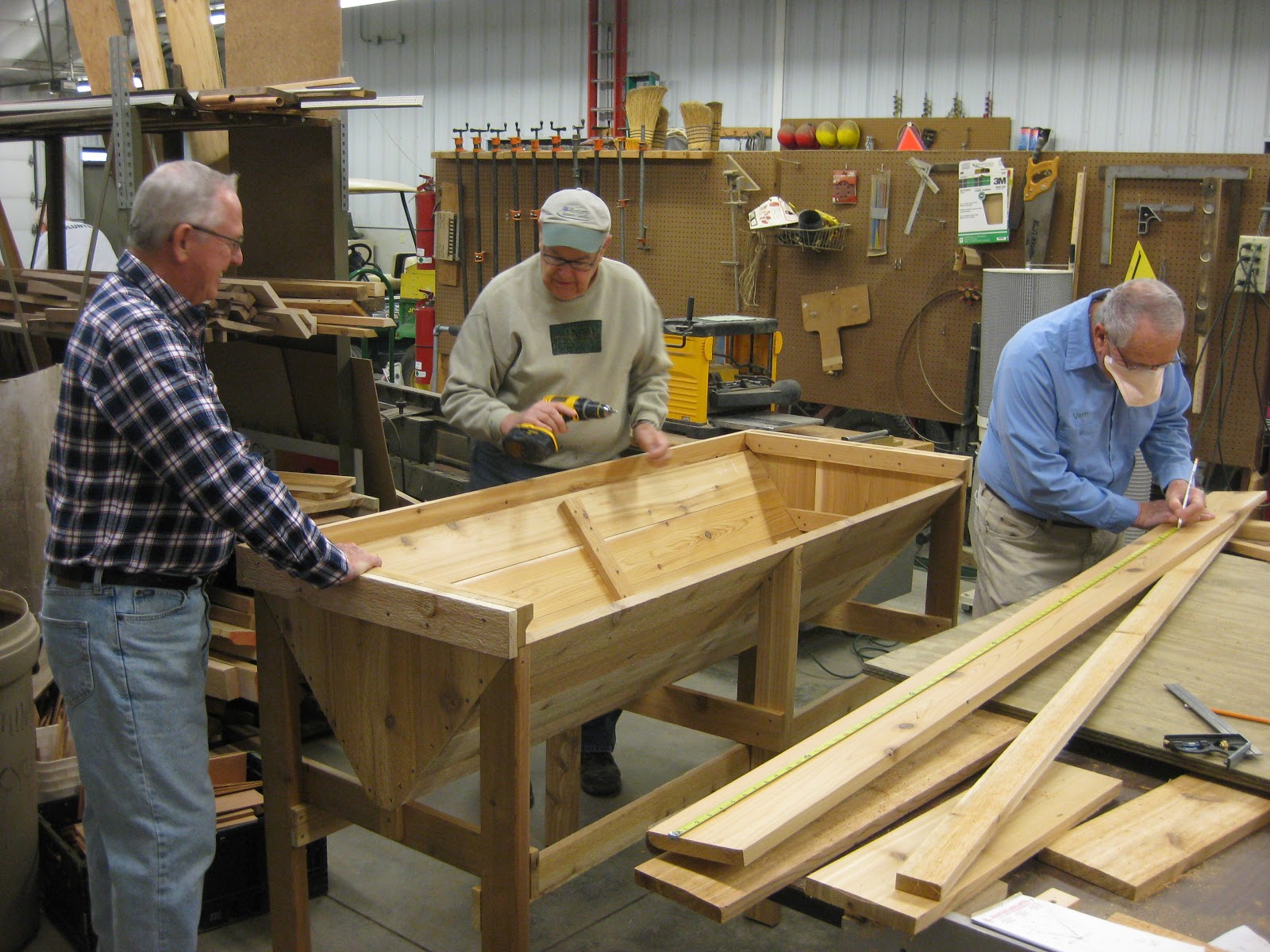 We had a busy morning at the gardens this morning. Our deer fence installation team, directed by Big John, consisted of Larry H., Lloyd, Bob C., Dick H., Russ, Rollie and Dick P. and Maury (seen below). It's tough to tell these two guys apart when they are both wearing goofy red hats. It was cold work this morning and unfortunately, part of securing the fence with cable ties required glove-less hands. Some of the guys also collected debris later in the morning. Dick H. came back later in the afternoon to help Big John continue with the deer fencing. The next photo down shows Urban (ground level) and Pat doing more pruning in the color rooms garden. These guys are a great team and continue to progress with significant pruning while the weather is still decent. The next photo down shows Del frantically working on more deer cutouts for the gift shop. The next photo down shows Bob. A, Jim and Vern working on a "no-stoop" garden trough that we'll put out in the gardens next year. The guys have really built some neat, accessible planters over the years and they have a full winter of projects ahead to keep them out of trouble. Dave T. was also helping with the carpentry but he's not as photogenic as the other guys. Stan spent more time tidying up the Japanese garden this morning. Gary continued his progress on labels and I believe finished and installed the remainder of the labels for the woodland walk garden. Janice was in to peruse some of our catalogs and is already thinking about 2013 veggies. We also saw Ron Y., Tom C. (more electrical help, thanks!), Marv, Marianne, Jim H., Bill O. and many others.