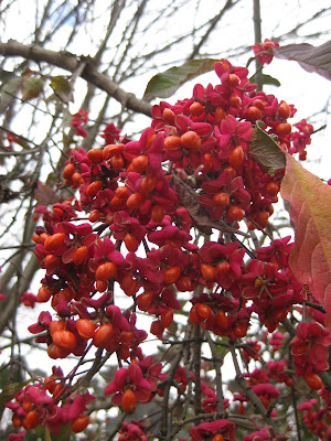 The gardens still have many beautiful plants; as your garden should as well. Directly below is the 'Silver Tower' Japanese silver grass (Miscanthus sinensis). There are many varieties of this Miscanthus species and this would be our tallest at close to 10' at maturity. Be wary of other Miscanthus species as some can become quite aggressive. The inflorescences (flower/seed heads) are top notch though and reminiscent of pampas grass which is not hardy for us. The next photo down features the showy fruits of the Korean mountain ash (Sorbus alnifolia) which also has impressive, white spring flower clusters and an orange fall color. I wish I had taken this shot a week ago as the birds have already been nibbling the fruit clusters (which I don't mind at all). The third photo down features the capsules of the European spindletree (Euonymus europaeus) which gets great fall color (maroon) and these pink fruiting structures that finally split open, revealing the orange seeds. Despite the toughness and beauty of this large shrub, it has proven to spread by seed in areas where it was introduced and we're starting to see many seedlings too with our milder winters. These may be destined for removal but I sure enjoy the fall show! The next photo down shows the architecturally impressive weeping Alaskan cedar (Chamaecyparis nootkatensis 'Pendula') near the gazebo. What a nice form. We had to prune off the lower branches as the deer nibbled them to down to nubs a couple of winters ago. Taxonomists are also calling this Xanthocyparis but the old name is still quite common in the nursery trade. The last photo shows the frost resistant foliage of the Italian arum (Arum italicum) which will stay green throughout most of the winter. This plant is a spreader in warmer climates and has proven happy in our woodland walk garden where it ultimately forms bright orange fruiting clusters in late summer, reminiscent of the native Jack-in-the-pulpit (Arisaema triphyllum).