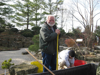 We had a great day of volunteers with Grumpies and many others. Directly below is Jumbo Jim who brought two RECAPPERS to help work in the Japanese garden. Stan and Karen were out there too. It was a beautiful day to be outside in the gardens. Bob C. and Ron Y. spent time hauling and spreading shredded leaves as mulch in the entrance garden. Ron and Bev W. decorated the last grouping of our 49 arches (total) for the HLS with clear lights. They do a superb job and the effect in the evening is amazing. Janice worked with the Chestnut House volunteers this afternoon and they collected a huge amount of leaves and debris from our east border garden. Gary and Pat continued making and processing plant labels and will head out in the gardens next week to do some more inventorying of label needs before the snow flies. Two photos down are Del (left) and Dr. Gredler peeling labels off of our plant signs. We re-use these aluminum signs every year for our annuals and Jenny will start making our new labels in February. The third photo down shows the progress on the 20' tall obelisk that Dave, Vern, Bob and Jim have been working on recently. The guys continued their progress today. This one will find itself out in the HLS soon....We also saw Dick P. and Maury who had some work at the other building. Little Jerry stopped by in the afternoon and it was good to see him.