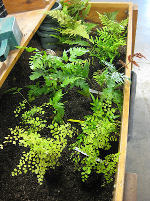 We had a small grounds crew today and with Larry and John on the road early, I helped get the Grumpies moving this morning. Aside from cutting plenty of evergreens this morning, both John and Larry continued projects at RBG when they returned. John hauled quite a few of the larger, freshly-cut evergreens to their permanent locatons and Larry helped organize more HLS elements at the Horticulture Center. Randy will be back this Saturday to repair the remainder of the rope light displays that need some tweaking. I bounced between various projects but didn't run any cords today unfortunately. However, we're in pretty good shape in regards to the HLS and it was nice to see L.P. Tree Service here today starting to hang icicle lights from our taller trees. They should be able to finish tomorrow or early next week. Directly below is the maroon fall color of the Chardonnay Pearls slender deutzia (Deutzia gracilis 'Duncan') which has nice golden foliage in spring and summer and neat white flowers in May. The bottom photo show some trial ferns that were just sent to us from the Hardy Fern Foundation. We are one of their satellite display gardens for ferns and look forward to trying these six new types of ferns.