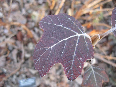 We had many other volunteers here today as well. Cindy (below) came in for another day of gardening and single handedly planted over 3,000 tulips (Tulipa) today. We had a very nice donation of tulips and daffodils (Narcissus) come to the gardens thru Jim H. (a Rotarian) and we're poking them in for additional color. Despite the December planting, our weather has still been mild and these bulbs should all do well. In the past, we've even planted donated bulbs as late as January with no loss of spring flower power. Pat and Urban were in for some more tree pruning out in the gardens and Urban also did some painting and prepping of our PVC planters. Marianne popped by this morning for some cleaning duties and milk jug luminary processing (we need empty, clean, 1/2 gallon milk jugs!). Marianne also continues to do a nice job of collecting and preparing any press releases, articles or other mentions of RBG out in the press. I think she's done this now for over six years. Dr. Gredler was in for painting and Maury stopped in as well. We also saw Dick H., Mary W., Tina B., Sue M., Rose and many others. The next two photos below Cindy show off some of the later features of the oakleaf hydrangea (Hydrangea quercifolia). Many of our specimens still have some nice leaf color (maroon) and as the leaves drop, the showy, exfoliating/peeling stems become interesting.