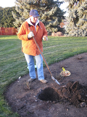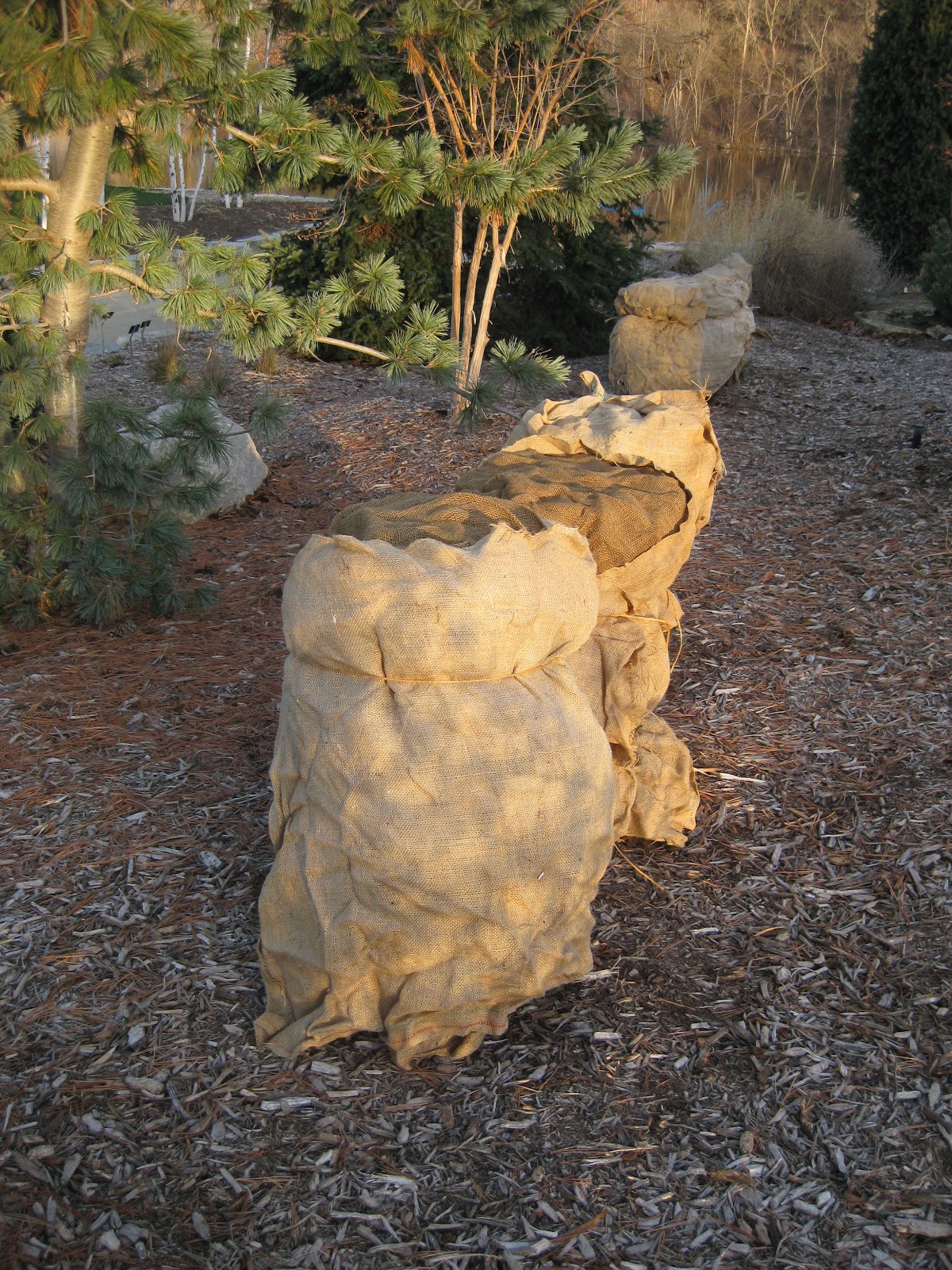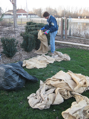 Today was a return to more "normal" temperatures which is something that has eluded us all year! Today was crisp in the morning but it was a nice sunny day that ended up near 40 degrees F. As seen above, the evidence of deer activity out in the gardens is everywhere. I've not noticed much nibbling yet but it is just a matter of time once the ground freezes and we get some snow. Larry H. (seen below) came in to continue his burlap artistry on our yews (Taxus sp.). Some of his handiwork can be seen in the second photo down. He's obviously a little sloppy with throwing burlap around but the end result is perfect. These particular yews are upright forms ('Hicksii') that were decimated by deer three years ago. Larry did a nice job wrapping these and was here most of the day. We still have a couple of evergreens that we'll screen off and protect later this week or early next week. The third photo down shows our snow fence protection for some of the Eastern arborvitae (Thuja occidentalis) hedge in the sunken garden. The height of that fence is only 6' which is no trouble for a deer to jump. However, by placing it 3' away from the hedge, we've created a questionable "landing zone" for the deer that may discourage any attempts at entering that "access envelope." This set-up has worked well for us in the past. We've exhausted our supply of burlap and most of our protective netting but should have enough to finish up for the season.