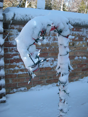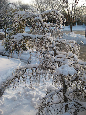 Yesterday afternoon got nasty in this area with wet, blowing snow, high winds and ultimately, 5-6" of accumulation over the slush from the morning round of sleet. We actually got lucky as heavier snows and tougher weather occured further north of us. The roads were slick as I headed home and I spent a couple hours shoveling my driveway and sidewalk at home. We decided to wait and clear all the snow today and with the help of Bill, Larry and Mark S., we did the best we could prior to the Holiday Lights Show (HLS) this evening. The gardens were beautiful with the new snow as seen in the sunken garden above and in shots further below. The lights should look pretty neat with all this white stuff. The shoveling was challenging because of the underlayer of ice/slush depending on where we worked. Our snow blowers had some issues with the heavier snow but we ultimately finished after six hours of clearing. Larry can be seen below. We also saw Dr. Gredler (painting), Dick H. (plowing), Pete and some others. We weren't in the Horticulture Center much until later in the day. I was worried about power problems (for the HLS) because of that "slush layer" but my early testing was successful with everything coming on (fingers crossed for tonight). The second photo down shows the frozen tread marks of one of the City of Janesville plows or probably a Caterpillar that helps with the plowing. The sun certainly helped melt some paved areas and the day was quite nice out in the gardens with plenty of fresh air. Not sure how much I'll blog before New Year's as I'm off next week (except for working the HLS). I'll try to sneak some in from home....