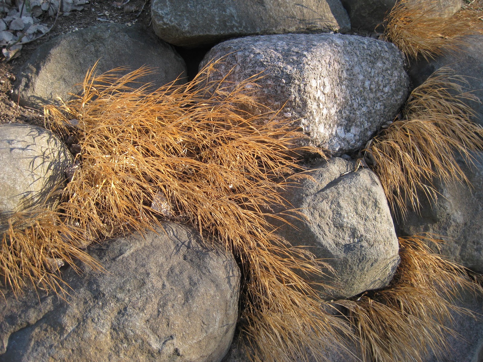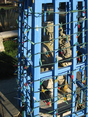 Today was a delightful day more reminiscent of a late October day with sunshine and temperatures around 40 degrees F. It looks like we'll have a warm next couple of days and certainly hope to continue some of our end-of-year gardening efforts. We may have some moisture this weekend too and while the lights show doesn't need it, the garden could use it. Tomorrow we hope to plant all the surplus bulb donations and should have enough volunteers to get everything in the ground. Tomorrow is also opening night for the Holiday Lights Show (HLS) and we hope to have a strong crowd over these first four nights of the show. The top photo shows one of our flower displays ready to go and directly above is one of our 50 or so obelisks out in the gardens with lights on them. Note the imprisoned cherub statue underneath the obelisk! Once the show is over, we'll bring in all the obelisks for "un-decoration" and ultimately, new painting based on our 2013 color selections. I'm sure Dr. Gredler is excited about this annual opportunity which takes a time commitment. Directly below are the seed heads of the 'Blonde Ambition' blue grama grass (Bouteloua gracilis) still looking sturdy near the alpine garden. I've heard this grass also called "minnow grass" for the horizontal seed heads that seem to be floating. The next photo down shows the second to last color stage of the golden Hakone grass (Hakonechloa macra 'All Gold'). This dark gold will turn brown shortly but holds on to color well and this wall planting has filled in slowly but surely over the years.