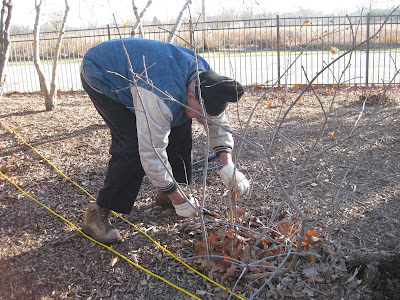 We had a nice volunteer turnout this morning with the nice weather. Pat was here bright-eyed and bushy-tailed and jumped right in to pruning in the color rooms garden (see below). Pat and Urban have been methodically going through the gardens and are focusing on pruning smaller trees and rejuvenating shrubs. Urban (second photo down) did a nice job thinning and cutting back shrubs along the east border. Stan was in to prune and tidy in the Japanese garden and Bill O. came in for some tasks as well. He emptied the soil out of some of our last containers for winter and always has the eye for collecting debris. Dr. Gredler continued his painting spree and is now touching up our trash and recycling bins. Marv also popped in for a visit. Janice came in for more research and we spent some time discussing our spring plant sale offerings (exciting!) and spring collections. Maury was in briefly in the afternoon and we also had a visit from George H., our worm casting supplier. He brought an early Christmas present of over 1,000 lbs. of worm castings (see bottom photo). We filled up two of our carts with this great soil amendment that we'll actually use during our bulb planting project. We'll again offer castings at our spring plant sale in May.