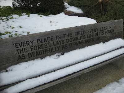 We didn't see a lot of volunteers today and Friday is usually quiet around the Horticulture Center. Dr. Gredler came in to process more drop cords and Bill O. came in to wrap up more of the larger cords for storage. Pat arrived in the afternoon to haul back some of our temporary spruces (Picea) for future chipping in to our mulch pile. Piles of trees like those in the bottom photo await relocation. Maury ran some errands for me this afternoon and that was most of the action for today. We had a productive staff meeting that covered some wrap up items for the Holiday Lights Show (HLS). We also talked about the looming Garden Expo sponsored by Wisconsin Public Television on February 8th through February 10th at the Exhibition Hall of the Alliant Energy Center (Madison). RBG will have a booth as usual and I'm giving four presentations (Trendy Annuals (twice), Annual Grasses and Vertical Gardening) over that weekend. The Expo is a great way to get a taste of spring with hundreds of vendors, demonstrations and seminars. See www.wigardenexpo.com/ for more details. Don't miss the RBG Spring Symposium this March 23rd (8 am - 4:30 pm) entitled Our Gardening Heritage. Check out our website under the Adult Ed tab and get more details on this popular, annual event. Below is another neat bench quote out in the gardens and further down, a heron trapped in the ice (only a sculpture, don't worry!).