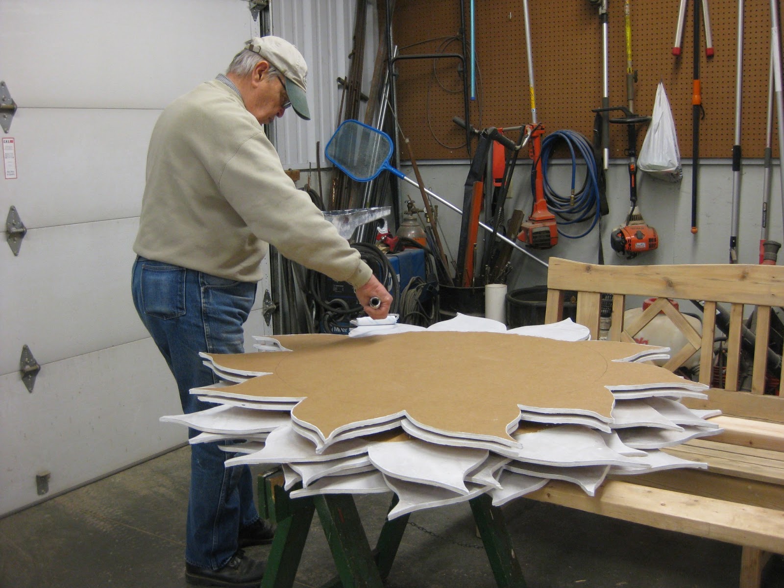 Today was a reminder of what the temperatures should really be like in January. Although it was sunny all day, the highs were only in the 20 degrees F with this morning being quite chilly for the Grumpies that headed outdoors. Above, Jim is putting primer on the garden art project (suns) this morning. The center circles still have to be affixed but the guys already have a good system for getting these primed and assembled. Dave T. and Dick H. were helping with this process and Bob A. was off in the wings continuing his painting (violet blue) of the new formal garden obelisks. Dr. Gredler continued processing cords inside and Del and Maury ran our reindeer displays to storage. Maury also ran out for some supplies. Gary continues to assemble or label order for this spring and we'll be getting various samples that will allow us to expand the use of our engraver for other sign needs, name tags, etc. Our outside crew included Dick W., Pat, Jim, Larry H., Urban and RBG Larry. The guys continued to haul back trees, displays, obelisks, lights and cords. The dusting of snow this weekend didn't slow anyone down and thankfully, Larry and Bill pulled up all the underground cords on this past Saturday when it was mild and the ground was unfrozen. Below are some of the pvc arches that Larry brought back to have the lights removed inside. We also had a nice visit from Little Jerry and caught up with him.