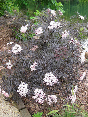 I spent more time today working on seed ordering and had small orders with three more companies. I now have 90% of my seed ordered and all the vegetable seeds for the spring plant sale have been ordered. I also worked on a grant, slide lists for upcoming presentations, plant records and am getting together spring plant orders. I was exchanging emails with Jeff E. (Director of Horticulture) at Olbrich Botanical Gardens (Madison, WI) and we both agreed on the merit of the Black Lace elderberry (Sambucus nigra 'Eva'). This dark-leaved shrub has textural value for sure but the threadleaf, almost black leaves have immense value too, particularly when placed near lighter plants (yellow, white, powder blue, etc.) that allow that dark foliage to "pop" out. The three photos down show this plant and the wonderful foliage and flower features. We have a couple of these around the gardens and every other year we cut them back severely for fresh new growth and a more compact size at 6' or so. These will normally get 8'-10'+ in size and have an arching or vase shape. Black Lace responds well to aggressive pruning and is durable in a wide range of soils and lighting conditions. I'll include this one in my talk on shrubs next week at Olbrich. At the bottom are some of my kitschy garden items on my porch table out back. The recent light dusting of snow and the collective stares of these creatures attest to the cold temperatures although it looks like rain next week!