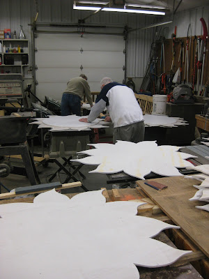 The wind chill this morning was well below zero degrees F but it warmed up to around 20 degrees F by the afternoon. We had a nice turnout of volunteers that worked both inside and outside throughout the morning and afternoon. The photo above shows Vern (red) putting the second coat of primer on our garden art suns. The guys have totally finished some of these with the remainder to be completed on Monday. In the distance is Del disassembling the deer cutouts from the Holiday Lights Show (HLS). He will then stack these on pallets for efficient storage. Directly below are Dr. Gredler (red obelisk) and Dick W. (blue obelisk) doing some painting this morning. Dr. Gredler came back to apply another coat of red this afternoon. Urban helped Dick with some of the blue painting. The second photo down shows the assembly line on the suns with the application of primer being the focus (and last stage of the process). That photo also shows Bob, Urban, Dave T. and Jim. The third photo down shows Dave (white) and Jim working on the suns as well. Jim D. (new Grumpy) was in to help wrap up some more cords and Pat, Larry and Dick H. went out in the gardens to take down more lights. The guys also hauled back the rest of the temporary spruces (Picea) although their trips this morning were quite frigid. Gary spent time creating templates for some new labels that will be used this year. These included labels for memorial benches and some nice signs that will recognize our assigned gardeners out in the gardens this year and beyond.