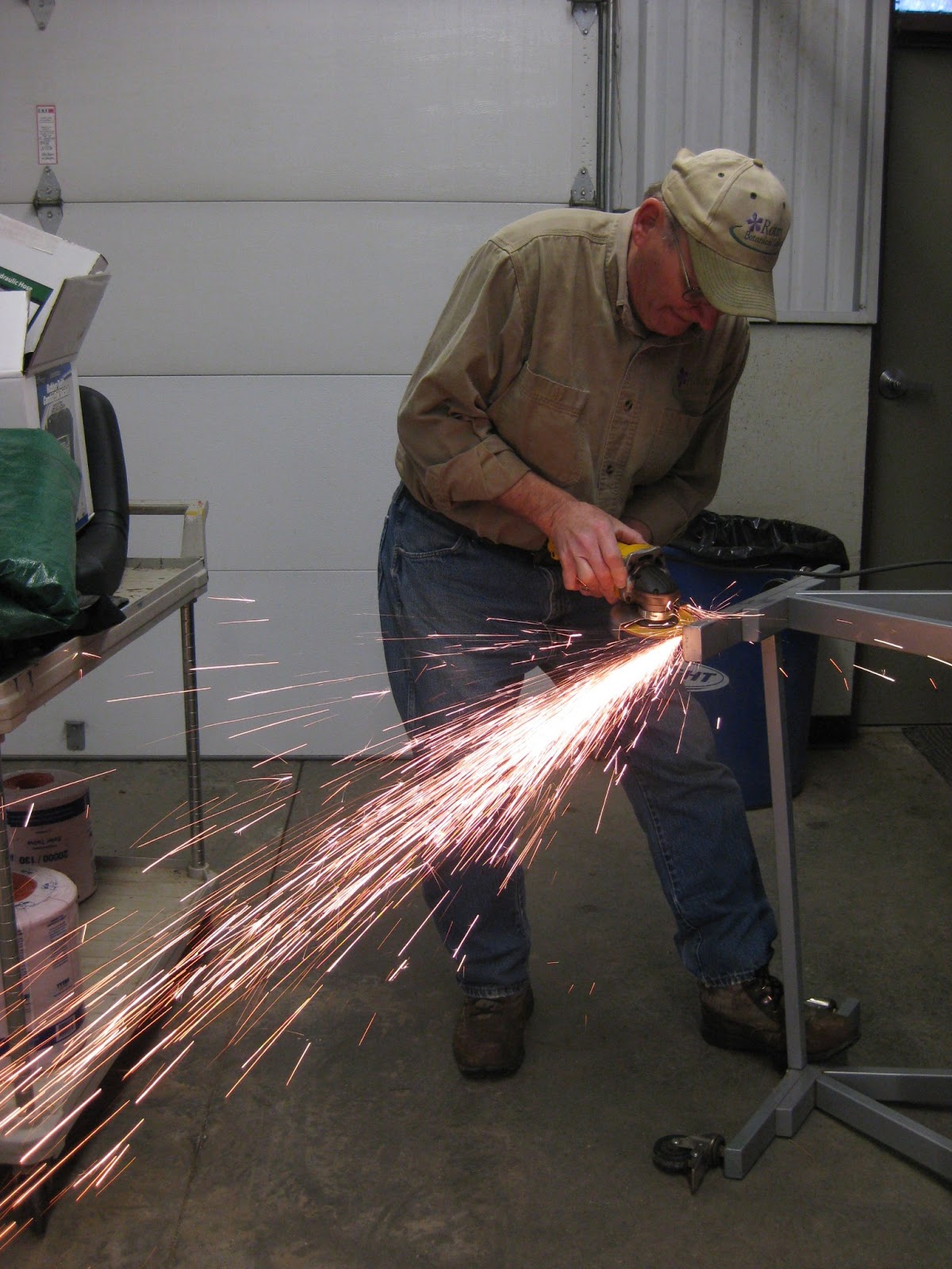 We had a busy Horticulture Center this morning as it was icy, windy and snowy this early although not overly cold. Above are Jim (green) and Urban working on one of the pyramids. Urban, Rose, Dr. Gredler, Pat and Jim all painted this morning. Vern, Jim and Dave all continued work on the benches with more sanding and re-staining. Jim (with hat) and Dave can be seen below repairing some of the benches. Ron Y. also continued his progress on sanding benches. Dick H. ran some errands and worked on repairing a cart for the other building (see his sparks below!). We also saw Del, Gene, Cindy B. and Bill O. later in the day. Gary was here for a bit and then worked over at the Parker Education Center. We had a nice visit from Marv and Marianne this morning and it was nice to catch up with them as they enjoy time to catch up with other tasks and duties. I tried to lure them out of retirement but to no avail. Larry was a big help with unloading our Expo stuff and he ran many other errands including picking up a nice tool donation.