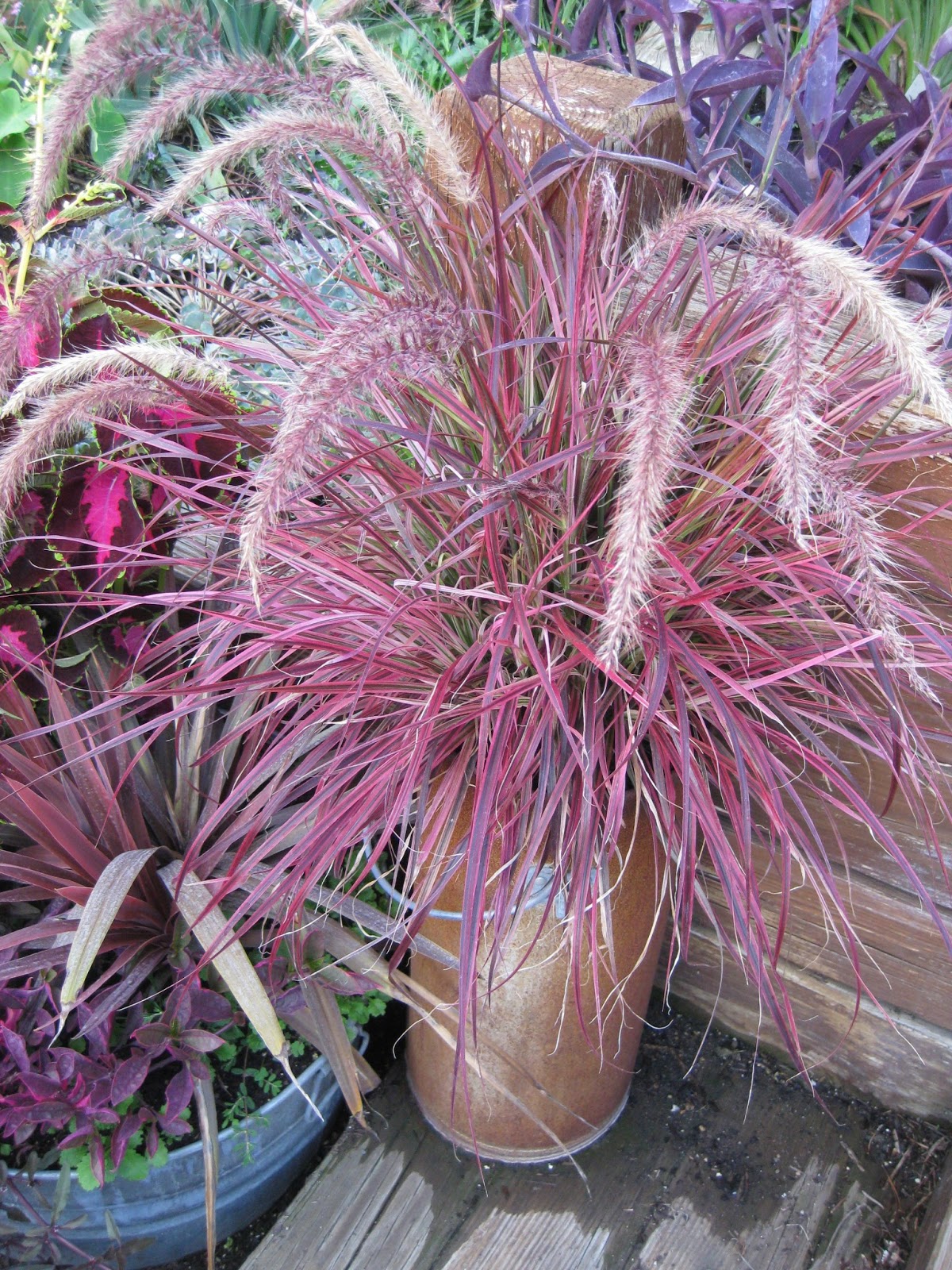 My "fireworks" reference is in reference to one of my favorite annual grasses (featured in all the photos below). This grass came out three years ago and is called a variegated purple fountain grass (Pennisetum setaceum). 'Fireworks' has a strong, pink variegation and looks good even before the inflorescences (flower/seed heads) appear in late July. This medium height grass (36"-40") is perfect for the mid border (see directly below at the Chicago Botanic Garden) and in the container (bottom four containers). Position in full blazing sun for the best coloration. I would not be without this grass and that's why I have 100 or so coming to the gardens this year. So what if it's not hardy and is "just an annual". Look at that impact! There is now a nice white variegated variety of annual fountain grass (Pennisetum setaceum) called 'Sky Rocket' and if you want one that has a more subtle, but effective pink variegation, look for 'Cherry Sparkler'. I'll show these others off in a future blog. Look for 'Fireworks' at the garden center and enjoy the "impact" in your own garden.