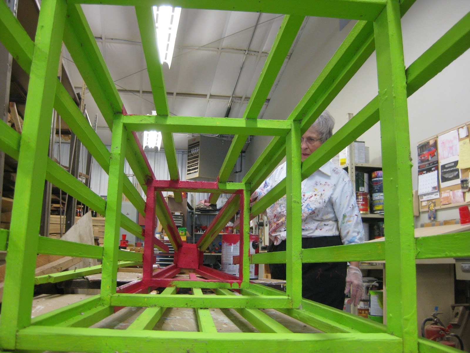 If anyone does a future GOOGLE internet search using the words obelisks, icicles and fireworks, my blog will probably be the only thing that comes up. After writing the previous sentence, I performed such a search and came up with 981,000 hits...weird (and scary). It was a productive day at the Horticulture Center with lots of painting occurring. This morning was brutally cold so we avoided garden work and stayed inside. Rose came in to continue the lime to red conversion of some 9' tall obelisks (top two photos). Rose is a great painter (don't let her colorful shirt fool you) and we appreciate having her help. These obelisks will go back in the Nancy Yahr Memorial Children's Garden for our new Pollinator's Paradise display. We'll have some flowering vines going up these with the intent of getting lots of butterflies, bees and other beneficial pollinators. We're excited about this two year theme which will be both colorful and educational. Pat and Urban (directly below) also painted and here they are moving one of our entrance garden pyramids in to position for repainting. Dr. Gredler was painting today as well and can be seen two photos down threatening me with a paint brush (happens frequently). Note to the right (same photo) that Urban is trapped and ultimately not released until he finishes painting the inside of that structure (one of three!). We also saw Vern who came back with some supplies. Janice was here for more research and Bill O. popped in around the lunch hour. It was a quiet but productive day.