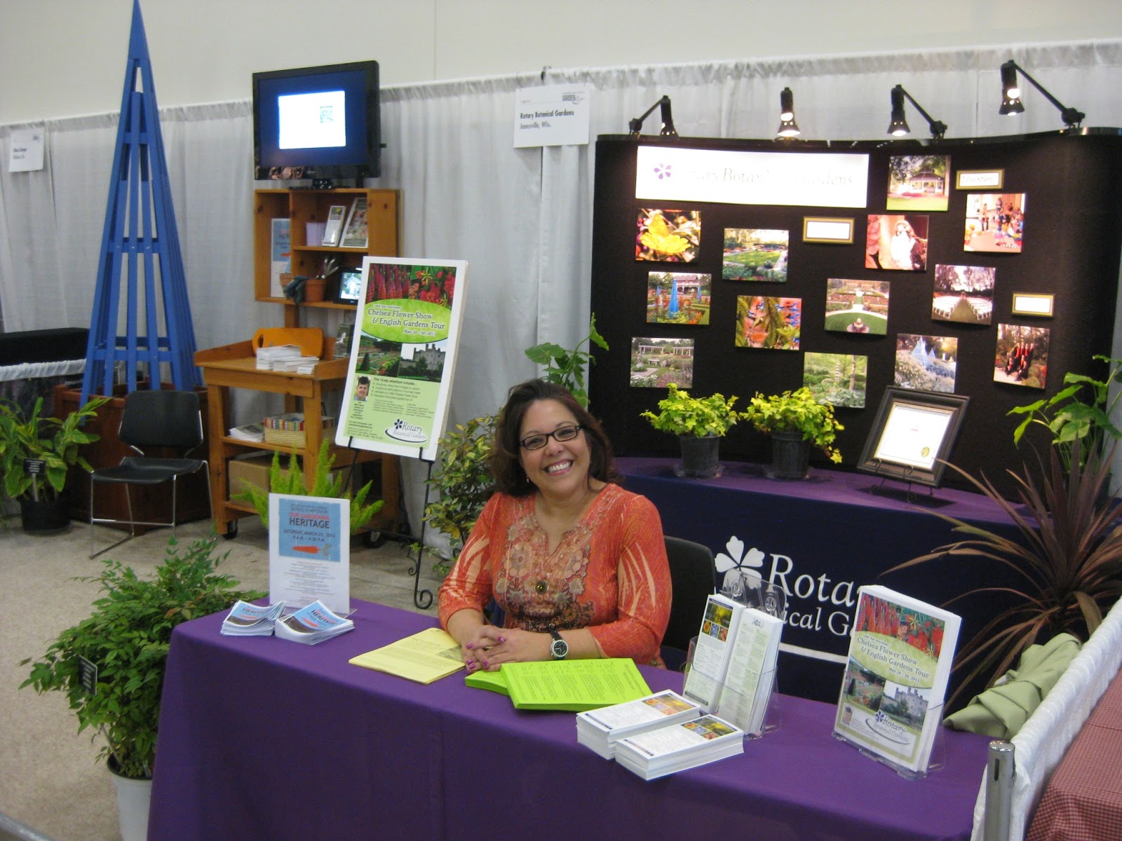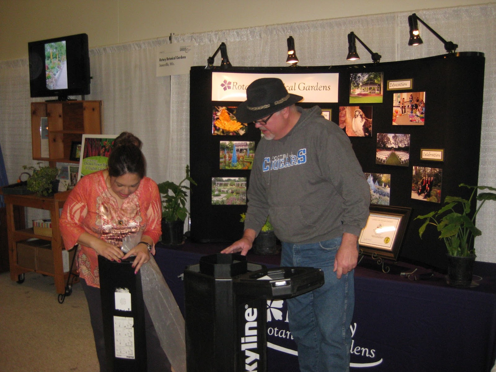 Today was a long one for me but certainly lots of fun. Big John, Denise and I drove up to Madison this morning (two vehicles) to set up our Garden Expo (sponsored by Wisconsin Public Television) booth at the Alliant Exhibition Hall. We're glad we delayed this trip from yesterday (bad driving weather) as we had smooth sailing all the way up and back. Above is Denise in our booth after we set it up and it was nice to have Denise's "touch" as I think this was our best booth ever. John and Denise can be seen below with some of the set-up. John and his "better half" Jackie then worked as volunteers for the first shift of the evening with Layton and Kathy replacing them for the second shift. Our Exec. Director, Mary, spelled me as well. We had no trouble setting up the booth and with the exception of a few items we'll bring up tomorrow, we had a very smooth set-up. Olbrich Botanical Gardens lent us quite a few plants for the booth which we greatly appreciate. The traffic flow was nice tonight and my talk on Trendy Annuals had about 150 attendees or so. Tomorrow I should have full crowds (300) for Vertical Gardening and Annual Grasses as Saturdays are packed and very busy.
