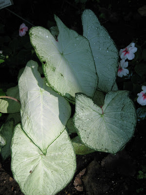 I ordered more caladiums (Caladium bicolor) this morning as they have been so effective in our shady and partly shady garden locations over the past couple of years. Native to Brazil and portions of Central and South America, this tropical has a long history in our gardens. There are many great suppliers of caladiums, most in Florida, and size of the "bulb" (actually a tuber) does matter when purchasing these. We typically will order 300-500 each winter of various varieties and start them in 4" pots in early April. We plant them in late May and early June when the soil temperatures are warming. The tubers can be dug, cleaned off, dried and stored like you would a canna or dahlia. With adequate moisture (vital) and some fertilization, we get some very showy foliage contributions from these plants. Some of my favorites are included below (identification under each photo) and there are over 1,000 varieties out there to consider!