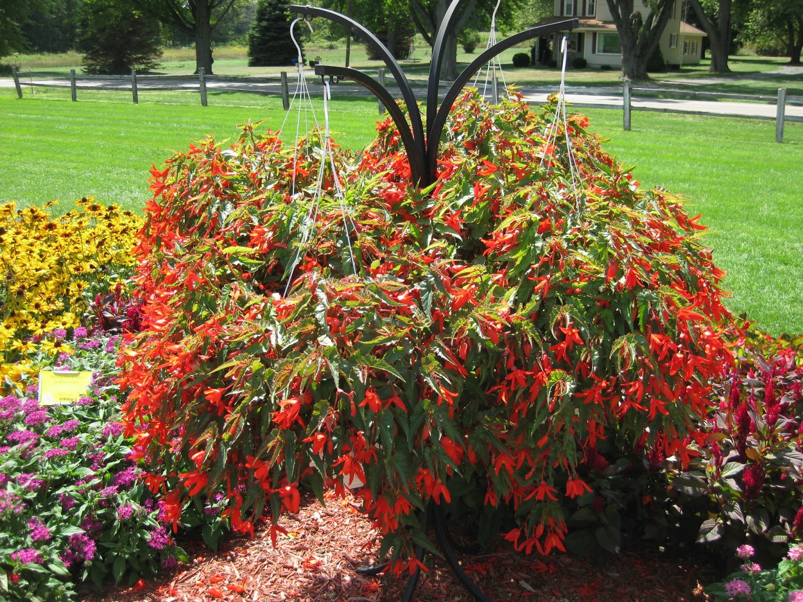 Our first two trailing begonia varieties that enticed me years ago can be seen directly below, side by side. To the left is 'Bellfire' and to the right, 'Bonfire Orange'. I was so impressed with their durability, particularly in part sun areas. We use lots of "other" begonias at RBG in bedding schemes, containers and other compositions. We always have durable wax begonias, Dragon Wing begonias, Rex begonias and other types for either foliage and/or blooms. While many of these are durable in shadier conditions, most of the trailing begonia species will be fine in part sun or even full blazing sun with adequate moisture. Imagine the impact of having thousands of dangling blossoms with accompanying pollinators and hummingbirds! The trailing begonias are a primary focus in breeding and promotional efforts and are finding a permanent niche in containers; particularly in hanging baskets. I've identified each photo below and encourage you to do some more research on those that entice you to re-engage and appreciate begonias in the summer garden! There are many more wonderful varieties out there that should be explored as well.