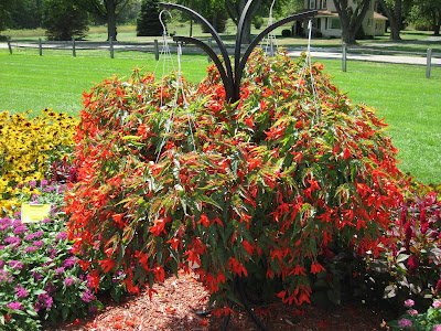 The two photos above and the one directly below are of the trailing begonia (Begonia boliviensis) called 'Santa Cruz Sunset'. This new variety from Benary Seed is a non-stop summer bloomer and as seen here on a 104 degree F, July day in Michigan, can tolerate plenty of sunlight. I took all of these images at C. Raker & Sons Nursery trial gardens although we had this variety at RBG as well. We have been using trailing begonias here at RBG for many years in not only containers but along the edges of low walls, slopes and other nooks and crannies where the spreading/cascading nature of these selections is appropriate.