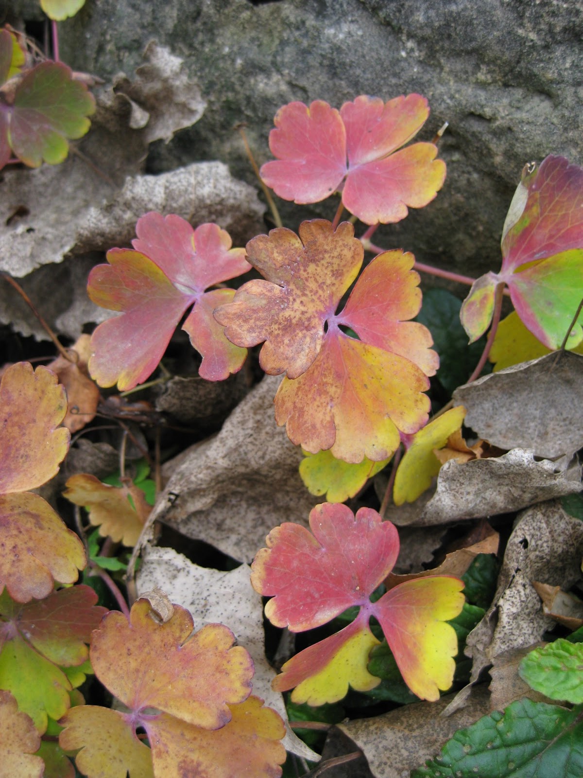 The primary interest in columbines is in the May and June time frame and of course their "bloom window" is affected by the type of spring we're experiencing. Last year, many columbines were peaking in April due to the advanced spring. Some species (i.e. Aquilegia chrysantha) blooms a bit later with flowers well in to June and early July. Regardless, the spring blooms are exquisite and exceptional with many flowers on a single plant. There are some varieties that also have interesting foliage like 'Leprechaun Gold', 'Woodside Variegata' and 'Lime Frost' which all have showy, gold/green mottled foliage. However, most species get a nice yellow fall color although Aquilegia canadensis seen below can get some nice reds and oranges on the October foliage (fourth photo down). If you grow columbine, observe the daily progress of the foliage coming out of the ground and opening up (pretty cool)!