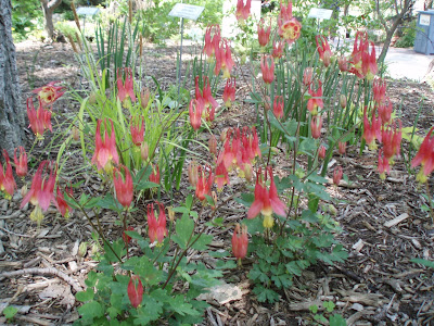 While not a new revelation for me, I continue to appreciate the importance of columbines (Aquilegia sp.) at RBG for spring impact in so many locations. In terms of the most exquisite flowers on a perennial, I would consider columbine blooms to be in my top three favorite (along with irises and monkshood). The spurred flower petals are quite showy whether the blooms are "danglers" like the native Canadian or Eastern red columbine (Aquilegia canadensis) seen directly below are more upwards facing blooms like the hybrid (Aquilegia x hybrida) 'Origami Red & White' seen directly above. The Latin derivation of Aquilegia translates to "eagle" as the blooms are thought to resemble the claws of an eagle. Native to the Northern Hemisphere, there are thought to be between 60-70 species of columbine and I've been excited to see so many new hybrids that are focusing on a smaller stature or more upwards facing blooms. Bees, hummingbirds and other pollinators enjoy columbine and I'm always taking photos of columbines when they are at peak.
