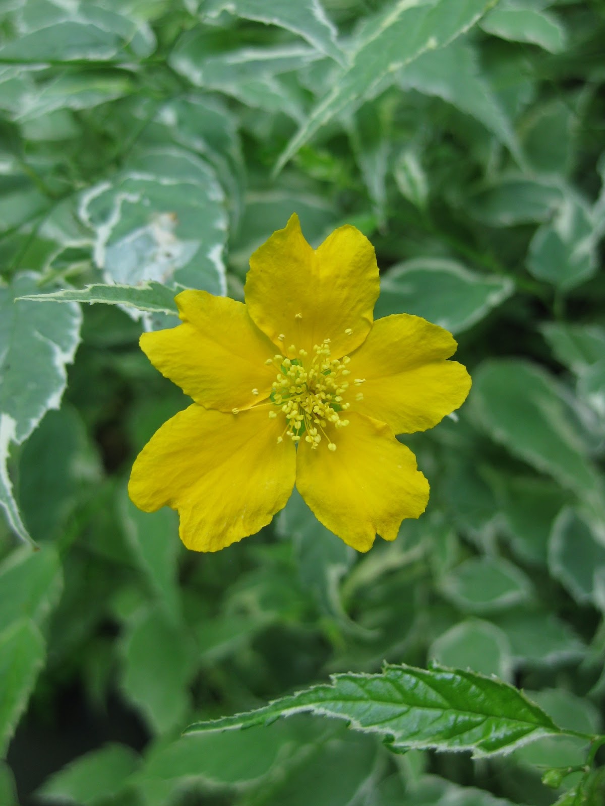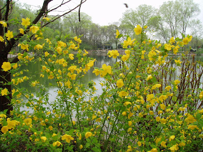 All the images in this blog feature varieties of Japanese kerria (Kerria japonica) which is also called Japanese rose. Native to parts of China and Japan, this member of the rose family is a strong spring bloomer with typically five-petaled, single or double yellow blossoms. There are some white (cream) bloomers too but I prefer the yellow for bright color in late April through mid May. A member of the Rosaceae family, kerria is adaptable to a wide range of soils although it doesn't care for clay. Kerrias will also tolerate sun, part sun and full shade. However, part sun is ideal as the flowers don't fade, have maximum longevity and the serrated foliage stays fresh. Our best specimens are in part shade. In full shade, kerrias will grow but not flower strongly With serrated leaves that turn golden in fall, this shrub also features green stems which I consider marginally interesting in winter (see further below). It is important to note that kerria is considered a "thicketing shrub" in that it does send up new stalks and continue to widen with age. Prune kerrias in spring after they are done blooming as they bloom on old wood (similar to a lilac). With a mature height (in our area) of about 5' tall, the plants will keep spreading moderately to 8'-10'. Some spring digging work can keep the "real estate" under control for these shrubs. Kerria naturally arches over and has a nice, informal look, particularly when in bloom. Some varieties are chosen for blooms like the single-flowering 'Golden Guinea' both above and directly below. The double-flowering variety 'Pleniflora' or 'Flore Pleno' is top notch too (see further below). Both 'Golden Guinea' and 'Pleniflora' received the Royal Horticultural Society's (RHS) Award of Garden Merit which says a lot about their value. 'Chiba Gold' has golden foliage while 'Picta' has a nice white variegation. All green leaf varieties will get some decent yellow fall color in mid-October in to early November. Both 'Shannon' and 'Honshu' are noted for extremely large blooms and the novelty variety 'Kin Kan' has green and yellow striped stems (doesn't impress me as a feature). What I like best about kerrias is their low maintenance and significant flower power in spring. These images, identified beneath the photo, lend value to the statement that kerrias are durable spring bloomers that perform best in part shade where their informal habit can be appreciated.