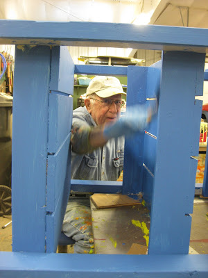 We had a solid volunteer turnout today. Pat and Urban braved the cold to accomplish more pruning in the Japanese garden. Jim (below) worked on this gate and other carpentry projects with Dave T. Gene was in for sanding and Ron W. hauled more benches to storage (fourth photo down) with some help. The second photo down shows the carved squirrel (done by Dave T.) that goes on top of the gate seen directly below. We've always called this the "squirrel gate" and it is located along the east wall of the English cottage garden when in place. Gary entered more label information and produced some new labels. Maury was also in for some errands and to stir up general havoc. Dr. Gredler can be seen painting in the third photo down and his brush was just a blur of activity. He's touching up one of our potting benches with a nice conversion from yucky grey to this neat blue. Janice and Cindy B. went mobile and worked with the Chestnut House volunteers on bagging up more pumpkin seeds for the spring plant sale. Our big vegetable collection at the Horticulture Center this year will include a wide range of neat, miniature pumpkins. We also saw Hal R., Del, Mary W. and many others today. At the bottom is a shot of our new garden cart that will be picked up shortly. This electric, 6 passenger cart, was funded by a generous grant opportunity and will have multiple (and immediate) uses out in the gardens. Sure looks like a sweet ride.