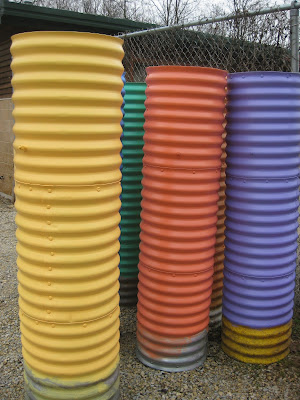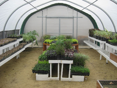Above are our "rainbow culvert planters" that we'll install out in the gardens very soon. They'll be located in the "rainbow garden" which will have a color theme (of course) and a strong focus on edibles and nutrition. We don't fill these with soil. There are some steel rods about 18" from the top which will support an inserted container of soil. We've used these in the past but they've not been this colorful in recent years.... The grounds staff kept busy. A break in the rain allowed John and Janice to head out for a bit although we had plenty of indoor work today. Larry continues to tune-up our mowers and other equipment. John, Janice and Larry unloaded a large delivery from Bluebird Nursery (NE) that ended up in one of our new greenhouses (see below). This is so much better than previous years when we would put these plants in the horticulture center with variable heat and very minimal lighting. Most of these are for the grounds although some are for our upcoming plant sale. At the bottom is the fall color of the red oak (Quercus rubra) and sugar maple (Acer saccharum). These are the two deciduous selections at our Spring Tree Sale held on May 10th, 11th and 12th (9 am - 4 pm daily). There are also five evergreen selections available. This sale is held in conjunction with our Spring Plant Sale. Check out details on both events at www.rotarybotanicalgardens.org.