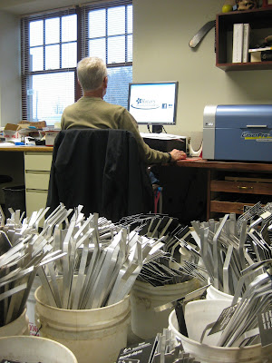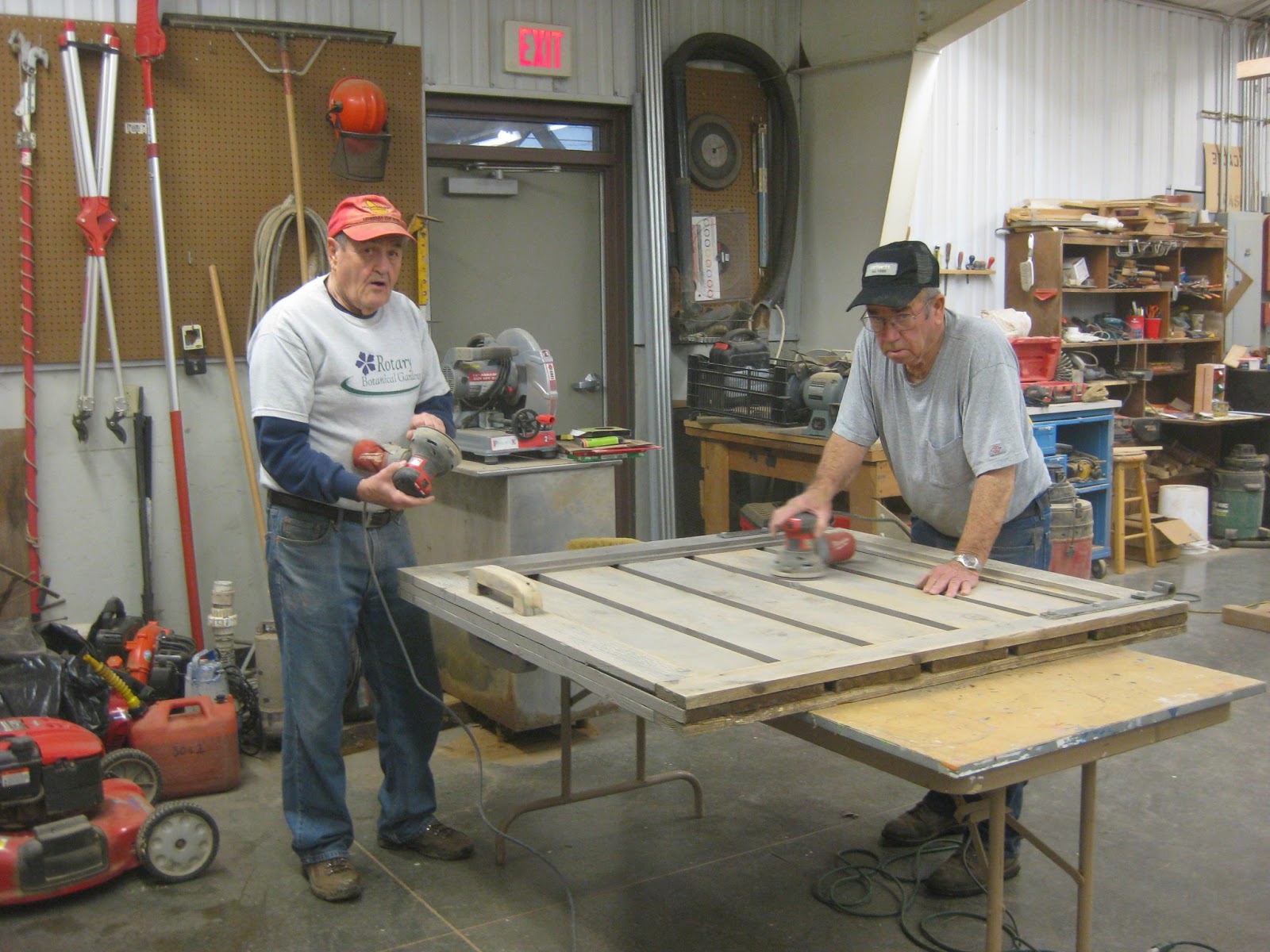 The morning rains kept us inside at the Horticulture Center but we had a very busy volunteer morning. Directly below are Bev (left) and Deb tweaking some of the garden art projects (suns) that will go out in the gardens shortly. Big John and Terry have already mounted twenty-eight of them out in the gardens with eight to go! Gary (second photo down) worked on making the labels for the individual sun projects and both Deb and Bev helped process those and get them ready to go. Out in the shop, there was some more sanding action. The third photo down shows Bob C. (left) and Gene sanding one of our gates for repainting. The look they are both giving me translates to, "Why don't you grab a sander instead of taking a photo of the action!". Pat, Dr. Gredler, Gena and Myrt were all painting this morning while Maury and Dick P. worked on some projects at the other building. Pat used Maury, Dick P. and Larry to haul out the bottom portion of our 20' obelisk as seen below (fourth photo down). This should be a real focal point in the garden! Del did a nice job tidying up the Horticulture Center. Vern sealed the remaining benches while Dave T. and Jim worked on some other projects. We also saw Bill O., Mary F., Rollie and others today.