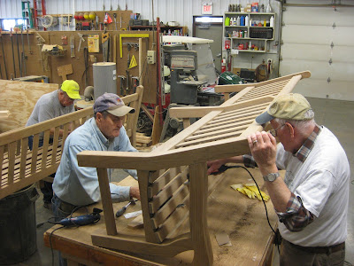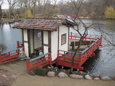 Volunteers today included Urban, looking perplexed directly below. He transplanted two compact ginkgo (Gingko biloba) specimens this morning and planted them nicely in the alpine garden. Lloyd (second photo down) was back and in action with some mulching duties out in the main parking lot. The third photo down shows, from left to right, Gene, Bob C. and Dave T. finishing up the big bench sanding project of 2013! Vern is applying sealer to the last couple of benches but I believe they should be totally done by the end of the week. While they were finishing the benches, other completed benches were being hauled out to the gardens and secured by Ron W., Ron Y., Rollie and Dick K. Dick P., Jim and Maury made a road trip up to Stoughton, WI where they picked up the plastic cylinders seen directly above. Along with help from Bev D., Gary continued preparing the labels that will go out to each of the installed garden art projects. Other Grumpies included Del organizing tools and Dick H. making many trips to the dump. The fourth photo down shows Jumbo Jim, Karen and Stan (in orange) continuing to review a brochure for the Japanese garden that we're developing. Stan and Karen were out in the gardens after this meeting. We also saw Jason O., John J., Tina B., Bill O. and many others today. At the bottom is a nice shot overlooking the observation pier to the arched bridge in the distance.
