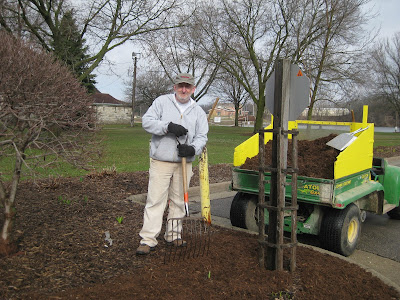 It was both literally and figuratively sunny out in the gardens today. The clouds broke this morning and we had some nice sunshine for most of the morning. While there are still April showers in the forecast for later in the week, we should get more "dry time" out in the gardens early this week. The garden art project suns (see above) are also adding color to the gardens. Big John and Terry put up the vast majority of these art pieces today and they'll follow up with the remainder later in the week. We're also developing signs for each individual art piece.