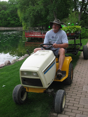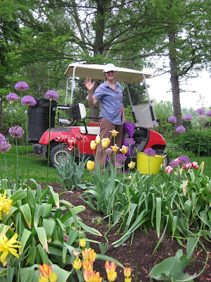 I was deciding on indoor projects for the rainy periods today but as it never became more than a light drizzle, the gang was able to work outside all day. Above is Terry who insisted on being photographed with flowers in the shot. He's definitely high maintenance but a great worker. Terry edged the sunken garden, mowed, went on a plant run with Pat and continued edging progress in the future All-America Selections (AAS) display garden. Big John (directly below) did a nice job rototilling, running irrigation, helping Terry with edging and many other tasks. Pat did some nice edging work in front of the Parker Education Center and moved on to mulching in the arboretum. He and Terry picked up some of our elephant ears (Colocasia) from winter storage which we'll re-plant back out in the gardens shortly. Cindy did a nice job in front of the building clearing tulips (Tulipa) and weeds. She helped with some other duties too and put together a nice cutting display yesterday. Cheryl spent some serious time weeding down in the sunken garden and later came up to help Jenny with some watering in the yard. She is a very thorough weeder! Jenny never left the Horticulture Center yard as she spent major time organizing plants and labels (mostly for the soon-to-be-installed AAS display) and later watered. I worked on various projects including placing plants for planting today and tomorrow. I'll try to keep a step ahead of the volunteers over the coming weeks!