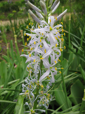 There is color around every bend in the gardens. In the sunken garden, the meadow rue (Thalictrum aquilegifolium 'Alba') seen above was at peak bloom and looking nice. This is a transitional time from peak spring color in to the combination of later spring interest and the shift to summer color with all of our annuals. Some areas will be addressed later as we wait for bulb foliage to die back and go dormant. The weeds are coming up quickly too but this time of year is no surprise in terms of juggling our duties; we just hope to have enough hands to keep up! Directly below is a wild hyacinth or quamash (Camassia cusickii) which is a nice shade of the palest blue (almost white). This spring blooming bulb (planted in fall) loves wet soils and we have many species and varieties of camassia out in the gardens. The next photo down shows the classic peony (Paeonia) and ornamental onion (Allium 'Purple Sensation') mix featured in a bed along Palmer Drive. The early peonies are peaking but many more are still getting ready to bloom in to early June.