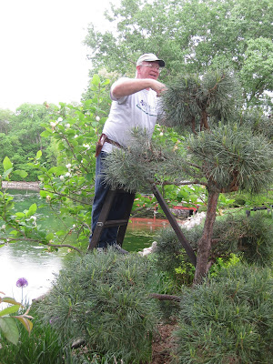 Despite the threat of a rainy day, we had many stalwart volunteers help out today. Above are Mary H. (right) and her daughter Kathy out taking care of their assigned garden. Our condolences go out to both of them as Mary's husband Dave just passed away and had long been involved with the gardens as a volunteer. Kathy and Mary are a great team and will continue to keep up the high quality of care in their family garden space. Directly below is Stan who spent significant time "candling" or shaping our pines (Pinus) in and around the Japanese garden. He has a nice eye for detail; here working on layering a Scots pine (Pinus sylvestris). The next photo down shows Patrea who was a whirlwind in two garden areas where she removed spent bulb foliage and weeded as she went along. She did a great job. Dr. Yahr helped her a bit this morning as well. The third photo down shows (from left to right), Mary, Gena and Myrt planting near the gazebo garden. They were joined by Nancy and the four ladies did a great job planting over 500 annuals in this garden bed. They are a productive and efficient crew to say the least. Dr. Gredler was out mowing and we also saw Mary W., Elsa, Ron W. and many others. The fourth photo down shows Shirley S., an education volunteer, helping facilitate youth programming at the gardens today. We saw many children and our talented education volunteers. Further down are some more colorful images from today.