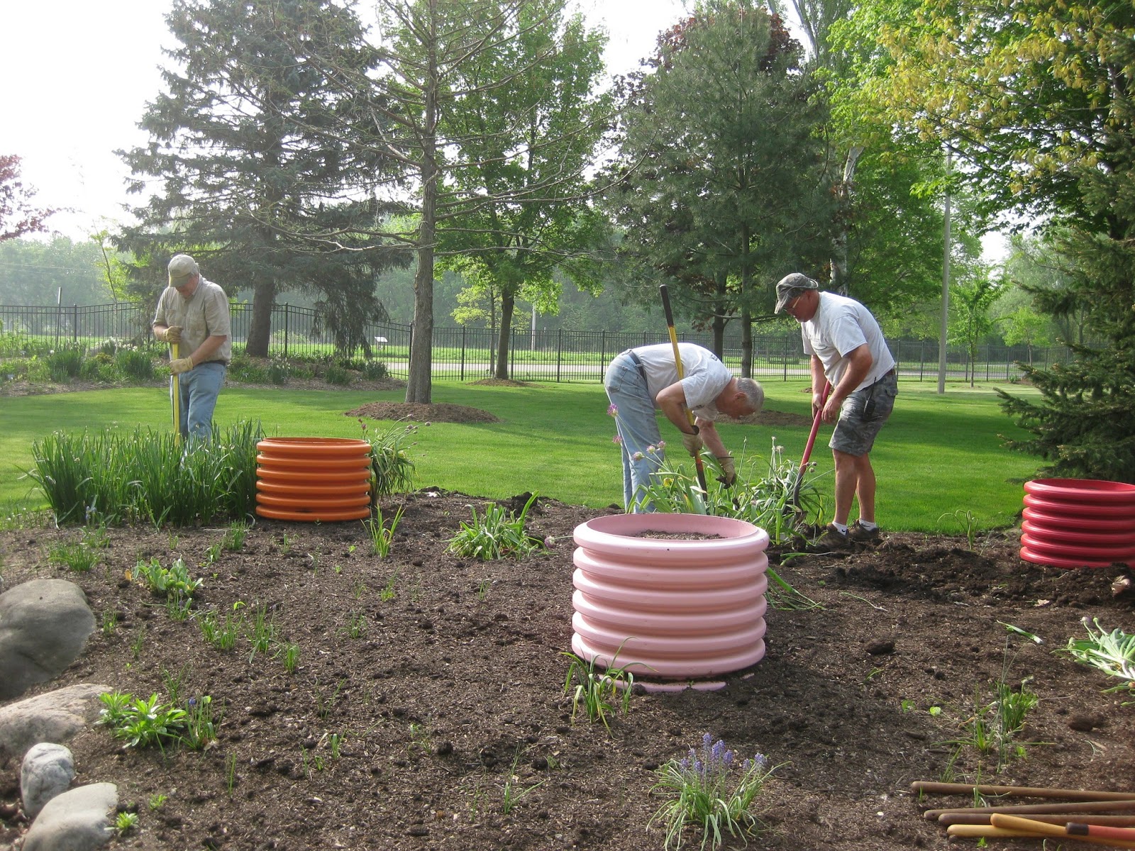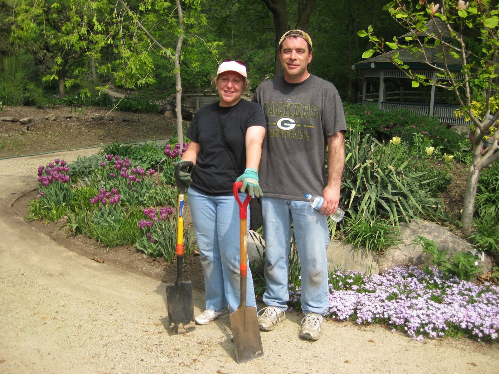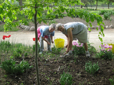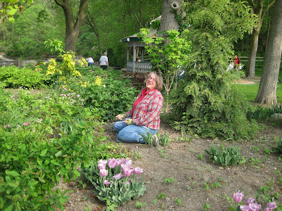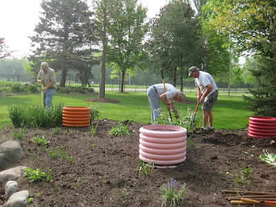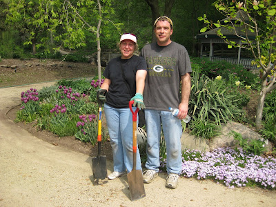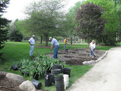 We had a great volunteer work day this morning and the weather was just perfect for a productive morning. The gang planted annuals in the gazebo garden, installed the flossflower (Ageratum) collection. weeded four huge areas and finished with planting over 200 perennials in the Nancy Yahr Memorial Children's Garden which will be our "Pollinator's Paradise" theme through 2014. Special thanks to Janice, Big John and Larry who helped orchestrate the work day and all the shifts, transitions, tool needs, debris clean-up, watering, etc. We're a well oiled machine. Thanks to our wonderful volunteers as well that can be seen in these photos. Great work Mary D., Barb C., Linda S., Bruce S., Keith, Jodi, Brent, Michael, Mike P., Kay, Sue, Donna, Renee, Karen, Hal R., Doris R., Amy and her daughter, Carol S. and her husband (forgetting his name...), Ron W., Bev W., Gena, Dennis, Maggie and Mary W. Bill O. was out tidying up before the wedding and Patrick C. and his wife Pat ran the compost sale (went well!). We also saw Dr. Yahr, Maury, Jumbo Jim and the RECAPPERS. It was a very productive day and apologies to any I missed. The next four Saturdays are also volunteer work days (8 am - 12 noon) where will be doing even more extensive planting.