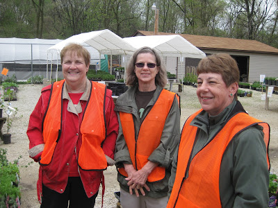We sure saw a whole lot of orange around the Spring Plant Sale and Spring Tree Sale today with our great volunteers. Both sales went very well and were steady all day. Today was the RBG Member only plant sale today and we saw many familiar faces and were able to get many new memberships as well. Above, from left to right, are Karen, Mary D., Joy and Virginia. Directly below are Kristine Z. (left) and Pat C. Kristine's all purpose smock wasn't regulation but we let that go due to her all day volunteer commitment. The next photo down shows Linda and Art and beneath them, Belle, Sue and Ellie who were helping sell our vast selection of herbs at the sale. There were more volunteers involved today than I can recount (or remember) but it was collectively great teamwork and the sale ran very smoothly. Thanks to those volunteers not pictured!!!: Mary W., Nancy, Pat M., Magda, Lynda, Karen, Virginia, Pat C., Mary D., Elaine, Shirley, Sylvia, Leslie, Mirjam, Becky, Gail, Gene, Cindy, Kay, Ron, Bob T., Karla, Stan, Russ, Maury, Glenn, Dick H., Dick P. (and the rest of the Golden K guys!!!). Polly, Lori and Rita were over as RBG staff to help too. The tree sale went well too with help from RBG volunteers working in tandem with members of the Blackhawk Golden Kiwanis Club. The fourth photo down shows just some of the 7,500 trees (seven types) that we're offering for this sale through the weekend (9 am - 4 pm daily).