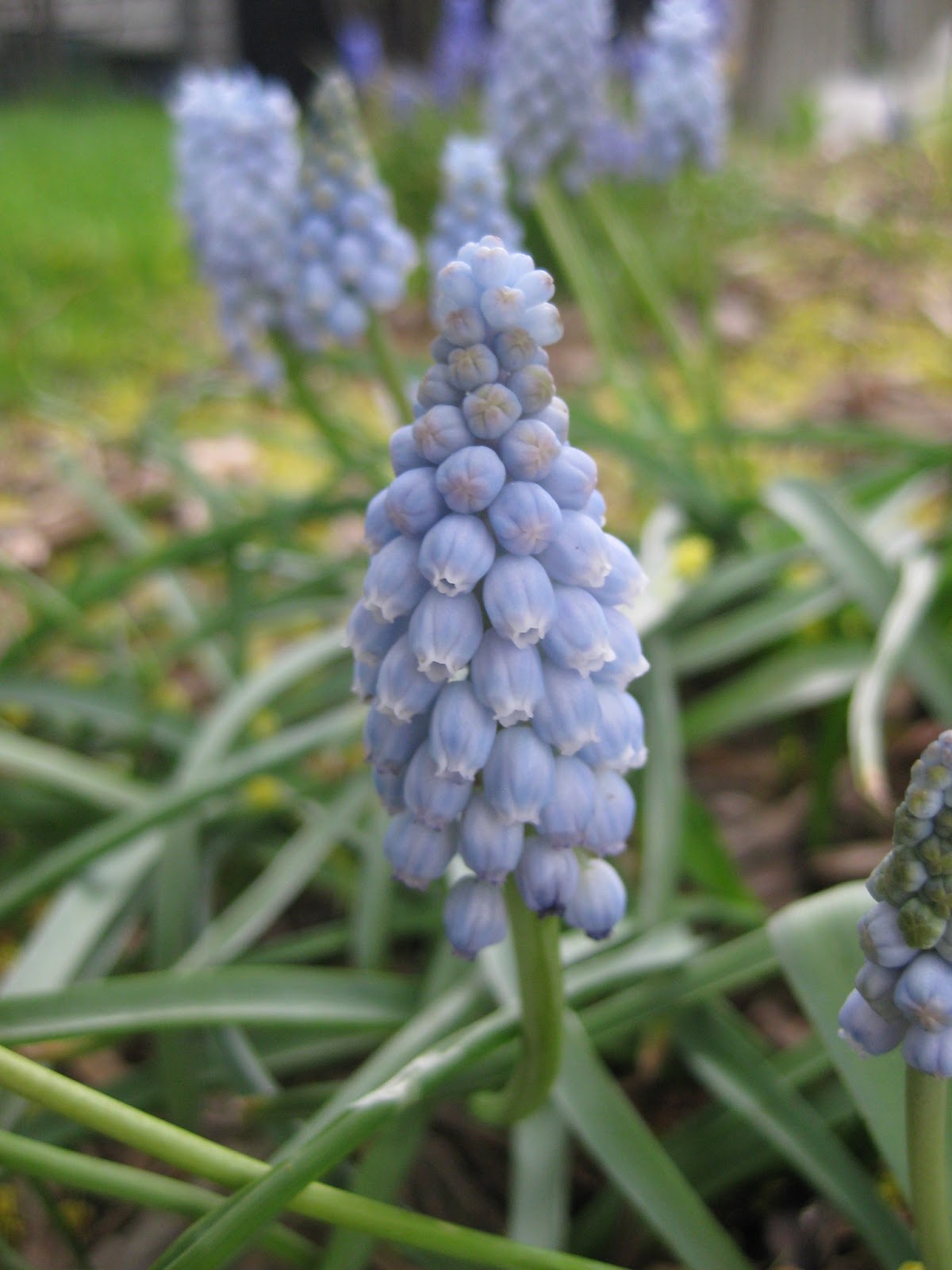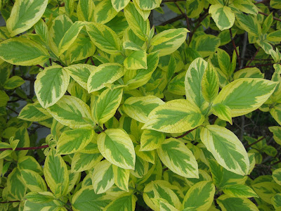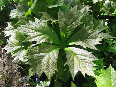 There's no shortage of color out in the gardens. Directly above is the new and vivid coloration of the Lady in Red ninebark (Physocarpus opulifolius 'Tuilad') which is really a very showy burgundy. These leaves will ultimately transition to a dark maroon by late summer but this early stage is quite engaging. Below is the bold foliage of the 'Rotlaub' Rodger's Flower (Rodgersia podophylla) in the shade garden. That bronze-tinged leaf cluster is almost 24" wide. This perennial also gets huge creamy flower plumes in early summer. The next photo down is the classy 'Valerie Finnis' grape hyacinth (Muscari armeniacum) which I never fail to enjoy (or photograph). With ferns emerging quickly with warming soils and air temperatures, there's none prettier than the Japanese painted fern (Athyrium niponicum var. pictum) seen three photos down. The early spring frond color is spectacular for all the varieties and our fern & moss garden is filling in nicely with over 200 types poking up here and there. At the bottom is the colorful foliage of the 'Hedgerow's Gold' variegated dogwood (Cornus sericea) which also has some dynamite red stems in winter. This is my favorite variegated form although the white variegated Ivory Halo ('Bailhalo') is nice too...