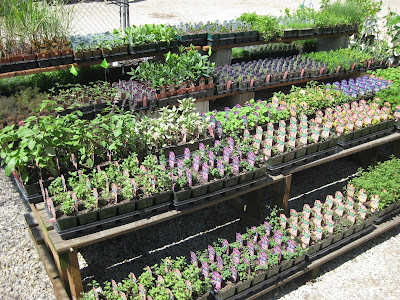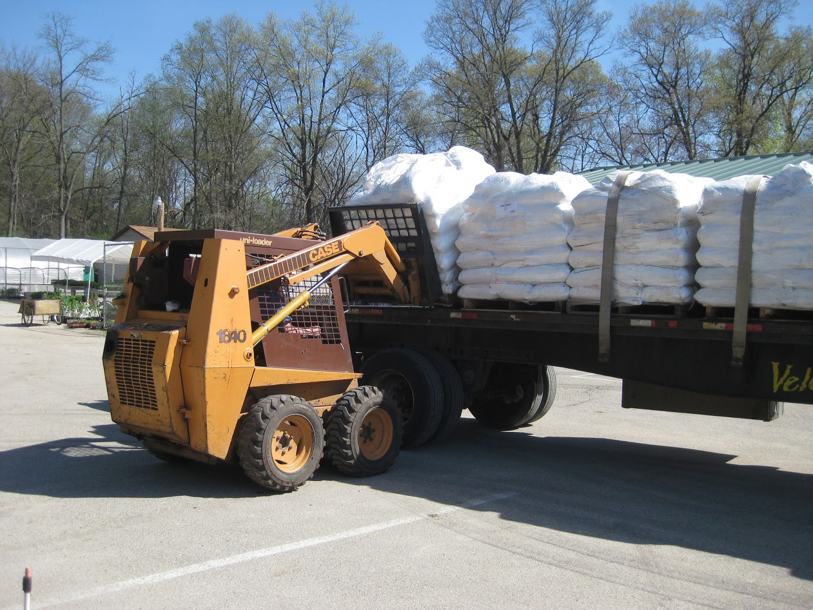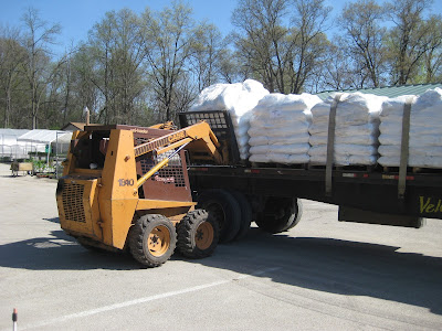 Janice, Cindy and I were attached to the plant sale for most of the day although both Janice and I were able to get in to the gardens briefly. Janice put together another nice cutting display at the Parker Education Center. Cindy continued marking/pricing shrubs and moved on to watering and other plant sale duties. Janice did a nice job orchestrating the organization of the sale as seen in the two photos above. We have more plants this year then ever with a respectable amount of vegetables, herbs, perennials and shrubs. The entire yard is full but nothing is too crowded. Larry (below) unloaded another 20 pallets (900 bags) of blended compost for the sale this morning as well. Larry also worked on mowing, fixing a leak in the sunken garden pool, working with the Janesville Water Utility guys on a project, etc. Big John and Pat also push mowed and moved on to other projects. John continued with some rototilling, stockpiling of mulch for a volunteer, birdhouse installation, watering and other duties. Pat did a dynamite job edging along our entire outer fence which creates a nice crisp line (and look!). We'll have plenty of volunteer tagging assistance tomorrow and Thursday and much of Janice's activity today was in preparation for the arrival of the "tagging troops."