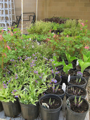 We had a sturdy batch of volunteers today. Dr. Gredler did some mowing and went out to spread grass seed as well. Kay spent most of the morning in a nightmare area that included a sloped bed west of the Parker Education Center. This slope had quack grass (Elymus repens), thistle and other nasties for years and Kay got an early crack at these offenders. She also collected plenty of debris. Roy and Mary came in for more composting of the shade garden and successfully spread many loads. Ron K. continued mulching the woodland walk garden from staged mulch piles compliments of Big John. He's doing a great job. Patrea W. was a huge help in the plant sale this morning and helped Janice organize and pre-tag a good portion of the sale. Bev and Deb were in and continued putting out signs for the garden art projects. We also saw Vern, Maury, Chuck S., Nancy N., Gary and many others today. Directly below is the 'Aurora' fernleaf bleeding heart (Dicentra formosa) which is a petite plant with long-lasting flower power. We have this variety throughout the woodland walk garden and the next photo down shows the early "forget-me-not-like" blooms of the 'Jack Frost' false forget-me-not (Brunnera macrophylla) in that same garden area. The showy, silvery foliage will steal the show after the flowers fade.
