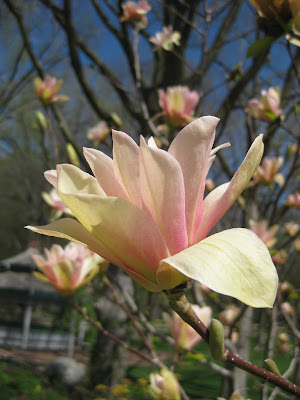 It was the perfect day out there today with blue skies, plenty of sunshine and a high of about 80 degrees F. With very little breeze, it was the perfect day for me to get out with more herbicide. I was able to disperse two backpack loads and targeted some areas that would be tough to weed manually (paths, along walls, etc.). My brief foray out in to the gardens was rewarded with seeing so many neat plants and views like that of the gazebo garden above. I saw many visitors around the gardens today and it's nice to see people enjoying all the spring color. I would say that peak spring color is happening now and will extend through the weekend in to next week. Of course it will be colorful beyond that and I always say there's not a bad time to visit the gardens. Although this is the narrow window when the daffodils (Narcissus) and tulips (Tulipa) are overlapping and many of the earliest perennials are blooming as well.