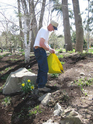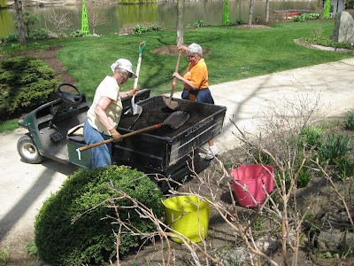 The volunteer efforts at the gardens today were remarkable. Directly below is Patrea who did a dynamite job helping Jenny with the composting project in the English cottage garden. Patrea and her mother have volunteered in the past and we look forward to both helping out again at RBG. The next photo down shows Roy spreading compost in the shade garden where he and his "better half", Mary, became reconnected to this space, their assigned garden. Here they are spreading our bulk, blended compost which is primarily horse manure, peat moss and other materials. We incorporate this material in to our annual beds and also use it as a topdressing or mulch around established and newly emerging plants. Nancy (yellow) and Myrt (orange) in the next photo down were doing the same compost spreading in a different part of that same shade garden. The next photo down shows Kay doing more work in the shade garden. It's amazing how much debris she can collect in a day and we'll rely on her very shortly for planting help after our Spring Plant Sale and Spring Tree Sale are completed. Check out the RBG website for more information on both of these looming events. Other volunteers included Del who did some mowing and we also saw Urban, Rose, Mary W., Bev F., Marsha M., Hal R., Doris R. and many others. The fifth and sixth photos down show our Chestnut House volunteers who did a great job weeding and preparing the vegetable beds at the Horticulture Center.
