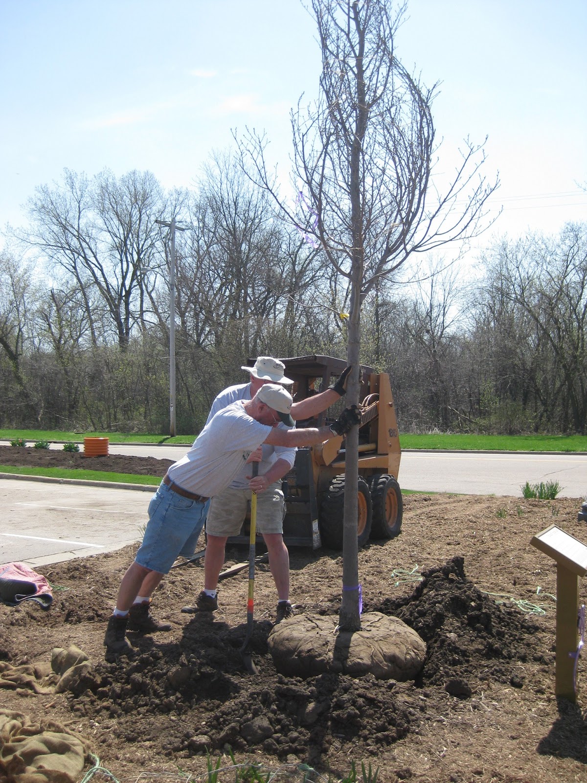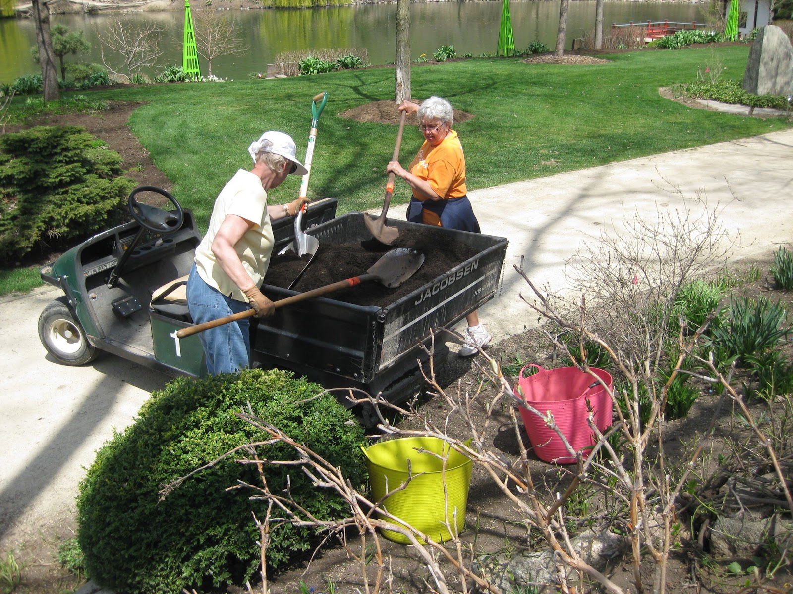 The grounds staff had a busy day. Below are Terry and Big John planting a new Triumph elm (Ulmus hybrida 'Morton Glossy') in the main parking lot. This is one of the elm hybrids introduced by the Morton Arboretum (Lisle, IL). The guys hung out together today and worked on a wide range of projects including hauling compost, mounting gates, edging and other duties. Jenny spent most of her day near the English cottage garden where she composted, collected debris, swept, etc. Jenny also did some watering but her day was very compost-centric. Cindy collected more debris, removed grass tufts from our primary paths and watered the greenhouses among other duties. Janice was in as a volunteer to work with the Chestnut House volunteers this afternoon and they did a great job (see further below). We also saw Pat who popped in for some compost.