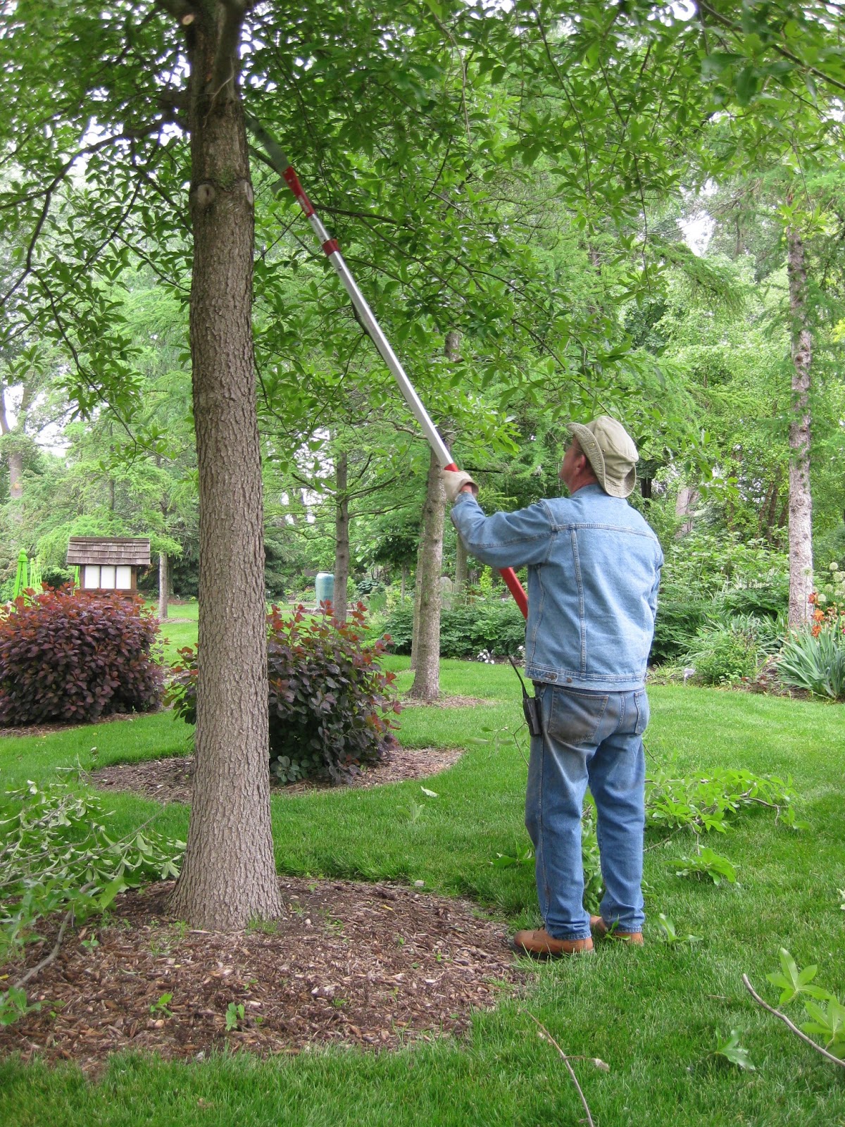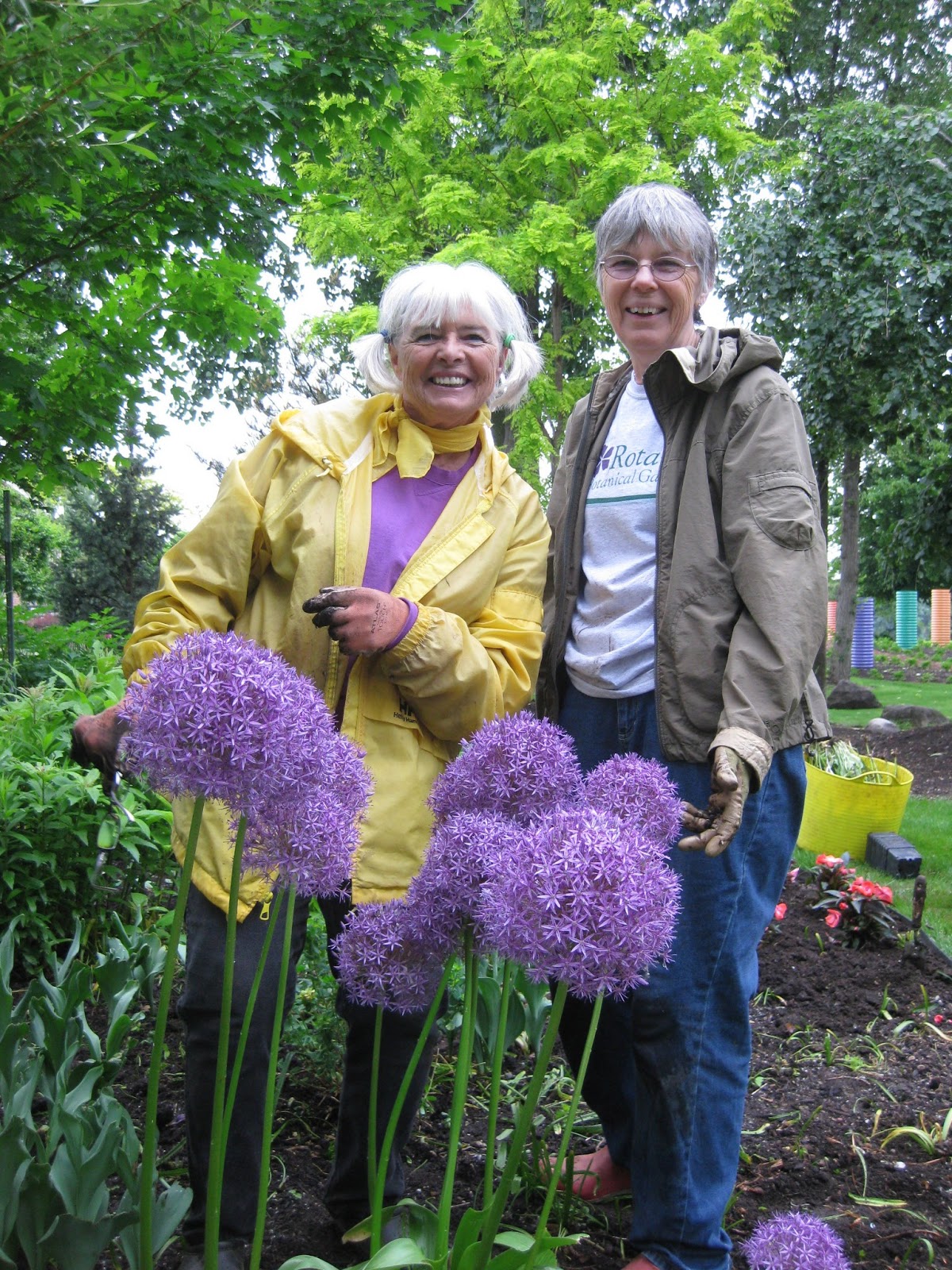 We had some great volunteer assistance today and the chance of rain didn't scare away our most stalwart of volunteers. Aside from Amy, Owen and Emily above, we had Marleen and Magda (seen above, Marleen in yellow) working in their garden space. The ladies did a nice job weeding, purging overgrown perennials and planting lots of annuals. Note how Marleen's shirt matches the 'Globemaster' ornamental onions (Allium) in the foreground! We had some Grumpy help too out in the gardens include Bob C. (seen below) who worked with Gene composting a corner of the sunken garden. The guys also did some weeding in that location. Dick P. and Maury helped get our major water line up and running this morning with some help from Dick H. and new Ron. Dick H. also made some dump runs and has spent the day working on the tail lights on our dump truck. Dave T., Vern, Jim and Ron Y. finished work on a nice planter for the Garden Gala (Dinner Dance) in July. The guys have plenty of looming projects as well. Bill O. came in for mowing this afternoon and Dr. Gredler took care of most of his mowing this morning. The second photo down shows three of our four Grumpettes that worked in the sunken garden today. It's tough to see faces but, from left to right, are Mary R. (in green), Marilyn and Winifred in the distance. Suzy is just off camera. The ladies weeded, cut back bulb foliage and planted over 500 annuals this morning. They did a super job. Gary finished some vital computer repairs and was in this afternoon fine tuning our laser engraving process prior to getting back in to action with the backlog of labels yet to be made. I was pulled in some different directions today so probably missed some of our volunteer arrivals. We also saw Dr. Yahr, Amy H. and many others.