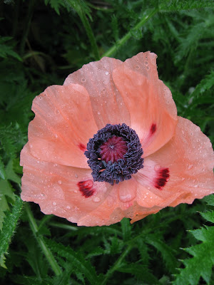 We had some great help today during our overcast and chilly day. It never really rained but there always seemed to be a light mist coming down. Above are Amy (mom) with her twins, Owen and Emily, planting in the English cottage garden. Here they are planting 'Merlin Blue Morn' petunias (Petunia). This team did a nice job and both Janice and Jenny helped them finish planting many annuals in that garden space. It didn't take much training for the kids to understand the nuances of planting and they both did a fine job and should be future gardeners (I hope!). Amy is part of a MOMS group that had scheduled this planting morning but the potential rain apparently kept everyone else away! Directly below is the 'Mystic Haze' dahlia (Dahlia) with showy blooms over maroon foliage. This selection is planted throughout the terrace garden which also features our orange theme for this year. The next photo down is an Oriental poppy (Papaver orientale) in the English cottage garden. The third photo down features the native, yellow wild indigo (Baptisia sphaerocarpa) peaking nicely out in the gardens in many locations. Those are some luminescent yellow flower spikes.