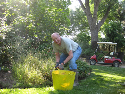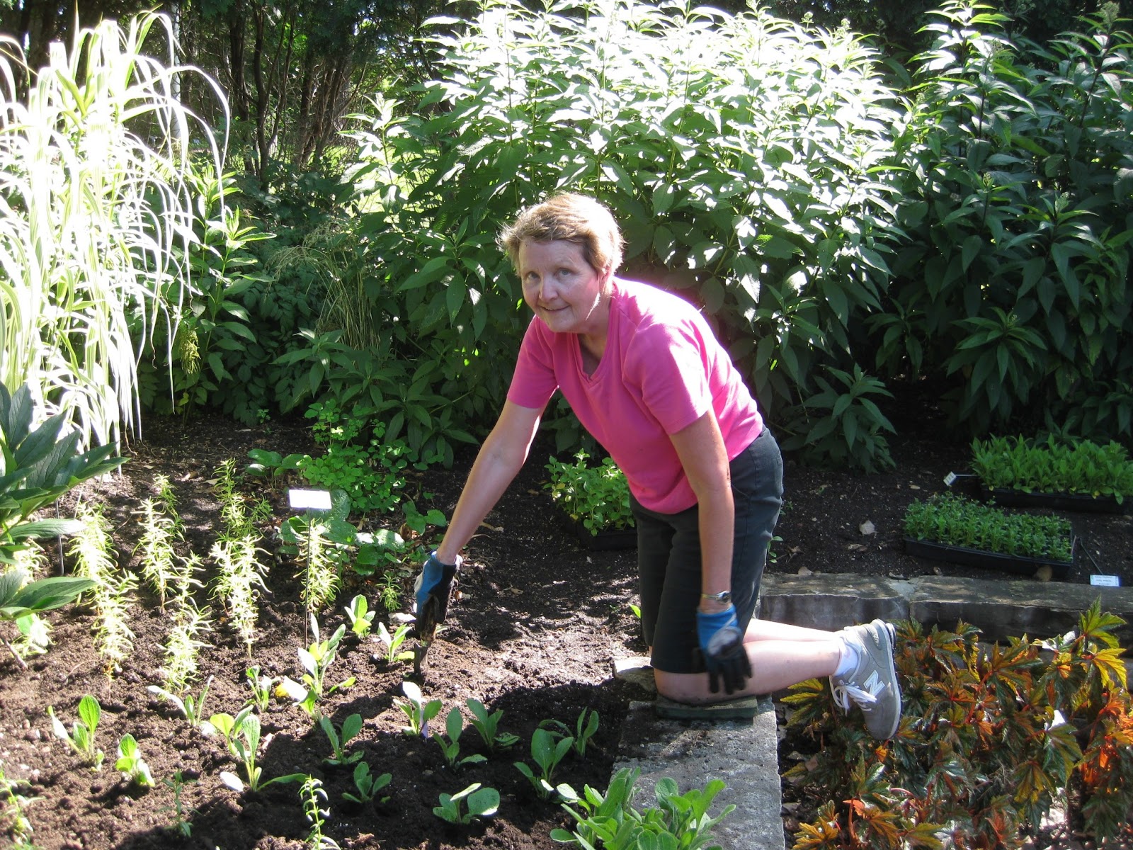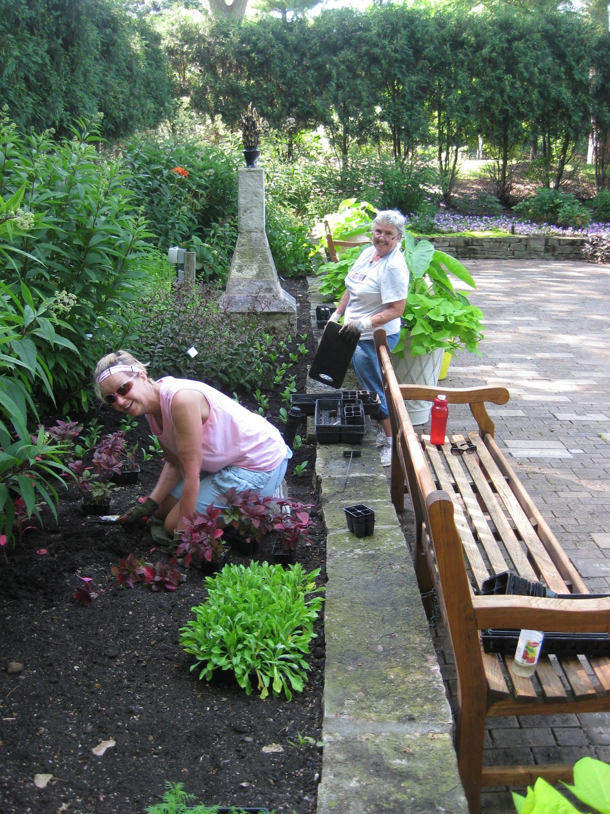Our volunteers all came and went by 12 noon to avoid the afternoon heat. Above are Kay (left) and Eva planting another area with "ornamental edibles". The flats I had placed yesterday in this space were visited by the deer last night and nibbled quite severely. The ladies did a nice job and had time to plant another area as well. Betty and Shirley came in to work in their areas near the arboretum and continue to do a nice job weeding and primping their two berms. Below is Bob T. who came in for some air edging duties. He does a nice job tidying up the edges around the beds that are adjacent to turf areas. Dr. Gredler came in for mowing duties in many locations. The second photo down shows Gena, who along with Mary and Myrt (next photo down, Mary kneeling), planted in the sunken garden today. They did a nice job despite the challenges of heat and mosquitoes. We'll continue to plant here and there over the coming weeks to provide filler in various locations. The yard should be purged by August hopefully! We also saw Dick P. and Ed L. (former Director at RBG, now Director of Allen Centennial Gardens on the UW-Madison campus) with four of his interns. Ed and crew were visiting various gardens today including ours. Further below are some additional shots of interest from today (identified under the image).