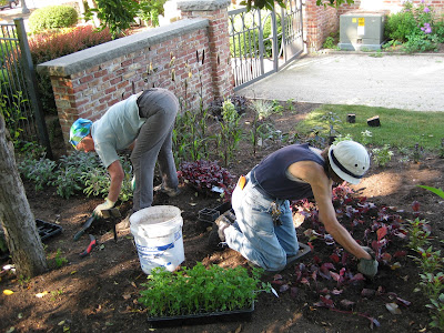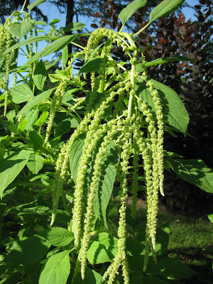 The grounds staff had a tough day out in the heat but managed to accomplish a lot of work including plenty of watering. Above is Cheryl tidying up the Flossflower (Ageratum) Collection. She also tidied up the North point garden (wedding tonight out there) and worked in many other areas including significant watering in the sunken garden and greenhouse. Big John ran irrigation all day and had sprinklers running in many areas. He and Terry also took care of watering our many containers throughout the gardens. John also mulched a good-sized area and worked on hand watering and other projects. Cindy was in for a half day and did a nice job tidying and watering in the English cottage garden. Terry also had sprinklers running in many locations. He also started staking the 100 or so green love-lies-bleeding (Amaranthus caudatus 'Viridis') plants (see directly below) along the lime wall planting. These tall annuals (4-5') tend to get top heavy with the trailing flower clusters and Terry's staking will help thwart flopping! I helped get our volunteeers going this morning and spent some serious time outside with herbicide. This hot, dry weather, while not fun to be out in, is ideal for herbicide applications. We are totally replanting the color rooms garden this fall and much of my herbicide attention is in that garden space right now. I'm also finishing up tasks related to the Home Garden Tour this Saturday (get your ticket for $10 in advance, see our website for more info!).