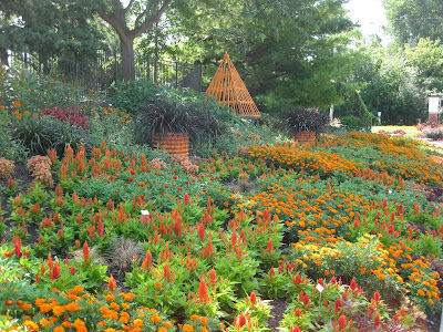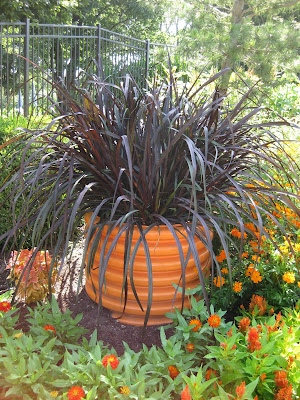 Larry and Big John had mostly watering duties today and are becoming experts in the "dance" of running irrigation, moving around sprinklers and keeping up with watering in general. Nice shot above of the 'Hot Lava' coneflower (Echinacea). Larry also push mowed and worked on other projects but watering became the most vital duty throughout the day as he also watered most of the containers too. John had many sprinklers going but also worked on some mulching duties, hand watering, sign installation and other projects as they fit in between shifting around sprinklers. Cheryl was in for a half day and focused her weeding efforts in the sunken garden. She does a very thorough job. Janice was back in action and helped get the morning volunteers situated before she moved on to more staking (along the lime border seen directly below) of taller plants. She also worked on some weeding, tidying, hand watering, moss work and other duties. I keep chipping away at the most timely tasks before I'm gone next week and am preparing for future events (fall plant sale, etc.). Below are some other nice images from today. Don't forget the Home Garden Tour this Saturday as the weather should be perfect!