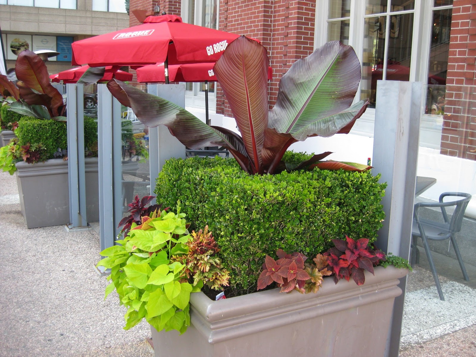 street side planter with ornamental banana (Ensete) as a centerpice.