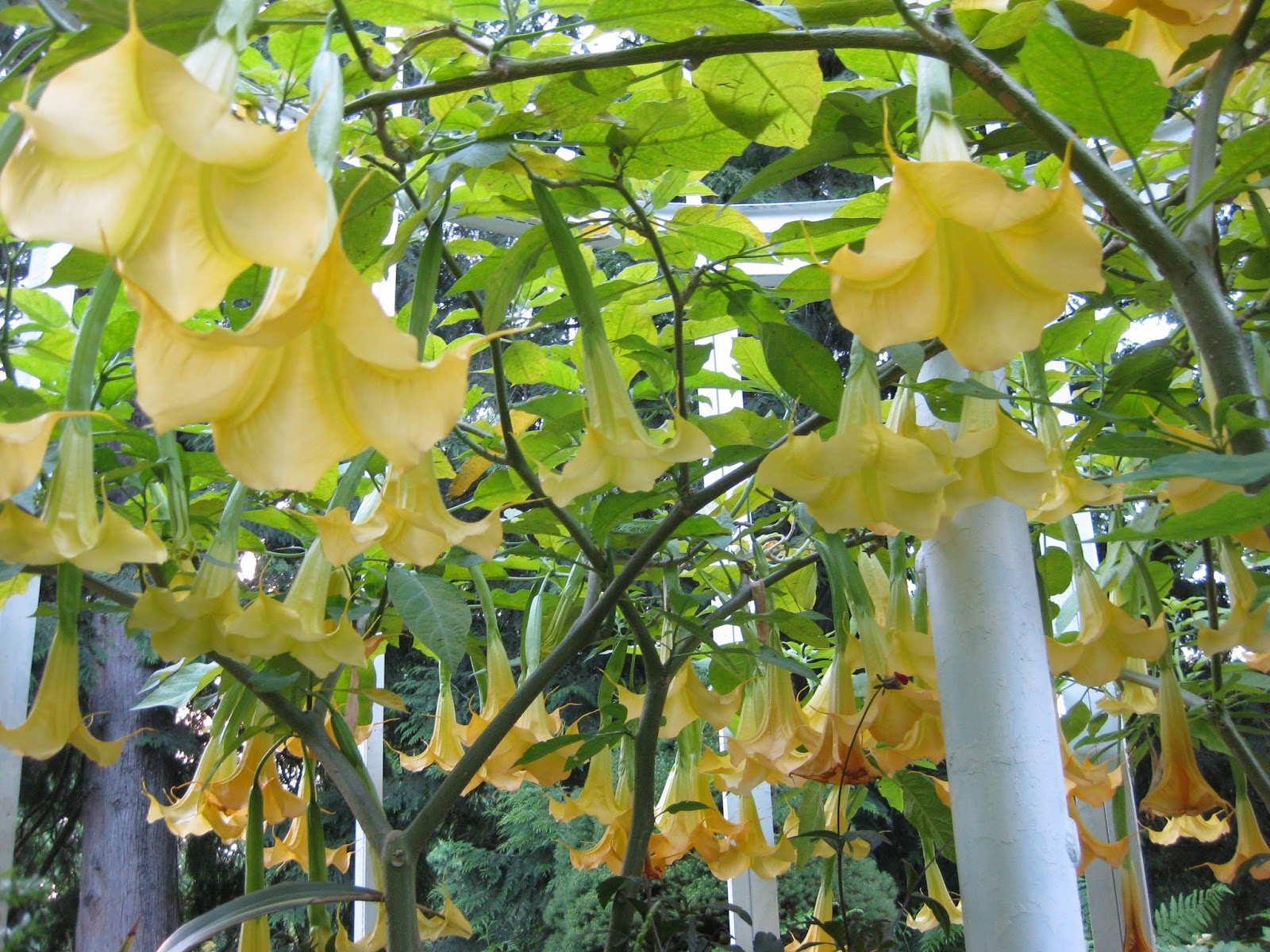 Above is a support with fragrant Brugmansia secured to the supports (Minter Gardens). Really cool. I've been in Canada a couple times and this is my second trip to Vancouver. All cities and cultures are different of course but I thought I'd share my observations of Vancouver... The city is quite vibrant and diverse with a very active populace biking, jogging, etc. There seems to be a lot of young professionals at least in the urban center of town. There is quite a bit of green space including Stanley Park which was recently named the most popular urban park in the world (with Central Park a close second place). People seem friendly and quite accustomed to Americans and tourists in general. The city is very bike and pedestrian friendly and I was amazed to see the populace stringently obey the crosswalk signs. I wonder if "jaywalking' receives a big fine? There are lots of dogs but I never saw dog poop anywhere. Vancouver seems quite clean but unfortunately there were lots of cigarette butts. Rush hour traffic here rivals that in any large city. There were many homeless although I was never hounded for "donations". A surprising number of these "homeless" were very young (18-24 year olds) and seemed to be in the counter-culture phase. In many ways, Vancouver reminded me of a larger Madison. Canadian money is fairly easy to figure out. Their smallest bill is a $5 and they use coins for $2, $1, and additional change (no pennies as they round up or down). Using a credit card is interesting in a restaurant as they bring you a mobile "swiper" which I never figured out and needed help with every time. Vancouver seems quite expensive but I can't say that it's any different than other large cities elsewhere. All in all, I can certainly see why people continue to flock to this city and live here. I hope to return sometime in the future before I'm six feet under. Looking forward to tomorrow but also getting home.