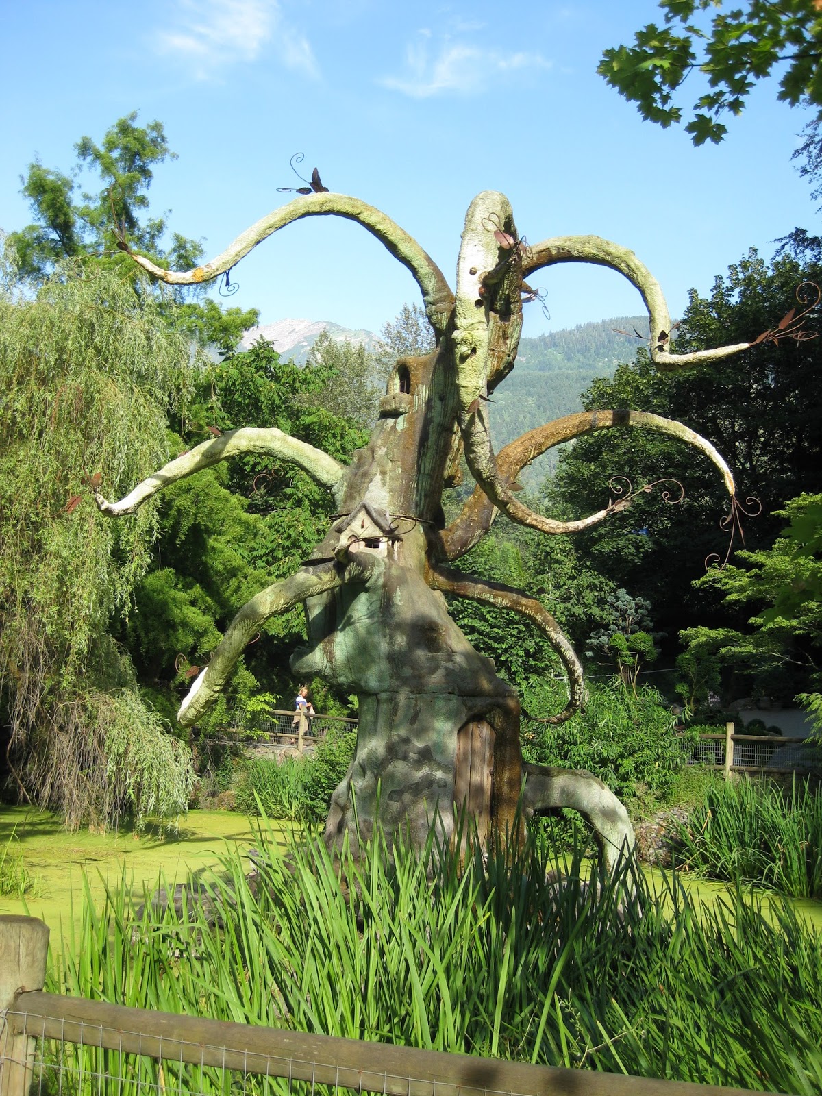 30' tall metal sculpture (emitting misty water vapor) in Minter Gardens children's garden
