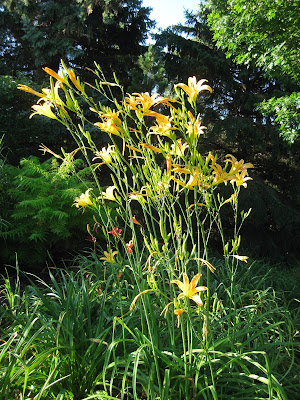 It was a beautiful day to be out in the gardens and we had some great volunteers come in to help out. Above is Terri who worked with Eva (below) in the Potter Daylily Collection. The ladies weeded and tidied up that entire slope this morning. Later in the day, Lisa I. came in and we removed and divided some daylilies and hatched plans for that collection (which Lisa has overseen for years). Kay (second photo down) was back in action and tidied up a good portion of the shade garden first which had lots of debris down from the rain and winds yesterday. She does a great job and ultimately reconnected with Terri and Eva later in the morning. These three ladies collected plenty of debris and their improvements were readily apparent! Mary W. (third photo down) helped tidy in the herb garden and continues to collect plant data that we'll use to generate new labels for the herb garden. This is the last garden that doesn't have any of our new, laser engraved labels. Dr. Gredler and Bill O. both did their mowing rounds while Del (fourth photo down) came in for some path clean-up in various locations. Betty and Shirley were in for a mobile cart tour with Chuck and enjoyed the gardens from his perspective (and from our neat, new cart). Mary H. and her daughter Kathy were in to maintain their area as well. We also saw Elsa, Dean and many others today. I forgot to mention it yesterday but Jumbo Jim came in with two RECAPPERS and they did a nice job in the Japanese garden.